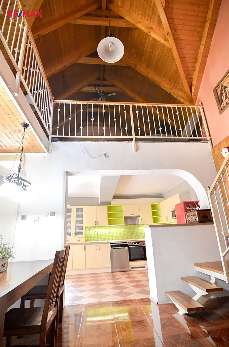 Na druhou stranu od jídelny je kuchyně, což vytváří příjemné prostředí pro rodinné chvíle i společenská setkání.