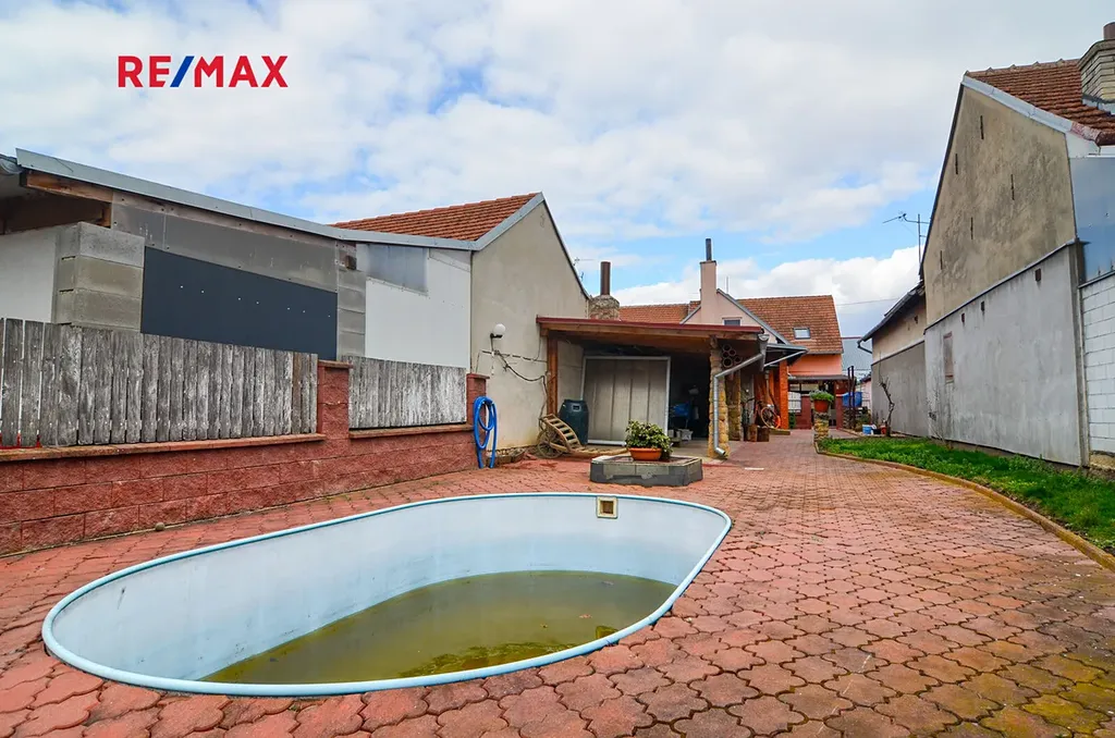 -na obytnou část navazuje dvůr, kde je kůlna, posezení , bazén a dále zahrada