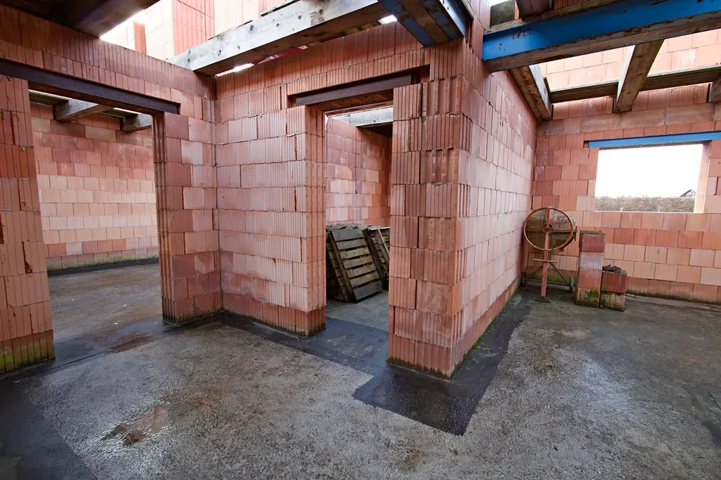 Na stavbě je provedena základová deska s prvním nadzemním podlažím z cihel o tl.44cm. Dále jsou položeny dřevěné trámy a vyneseny palety s materiálem na druhé nadzemní podlaží. V druhé podlaží je příprava na druhý věnec.