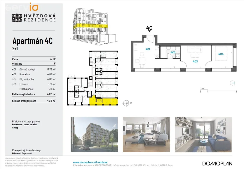 Nabízíme exkluzivně pronájem nadstandardně zařízeného bytu 2+1 o velikosti 46,15 m2 ve 4.NP s výtahem se sklepem a možností pronájmu krytého PS v objektu Rezidence Hvězdová, polyfunkční dům obklopený městským parkem, odkud je to na brněnské náměstí Svobody procházkou deset minut.