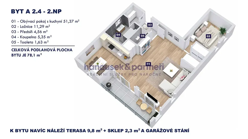 Nabízím vám byt s dispozicí 2+kk o velikosti 78,1 m2. V bytě je obývací pokoj s kuchyní, ložnice, předsíň, koupelna se sprchovým koutem a samostatné WC. Nachází se ve 2. patře domu A a navíc k němu patří terasa s výměrou 9,8 m2, sklep a garážové stání.