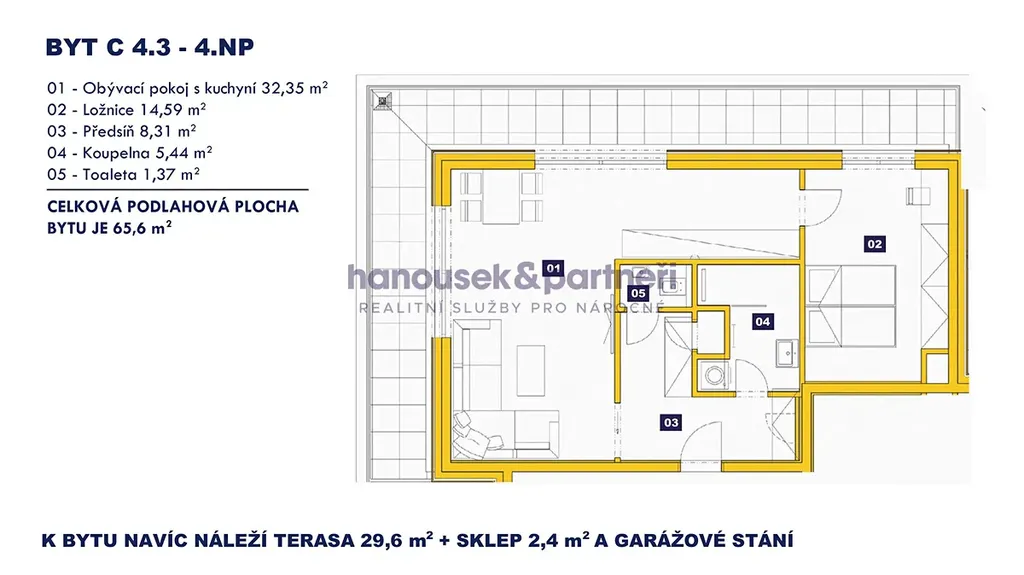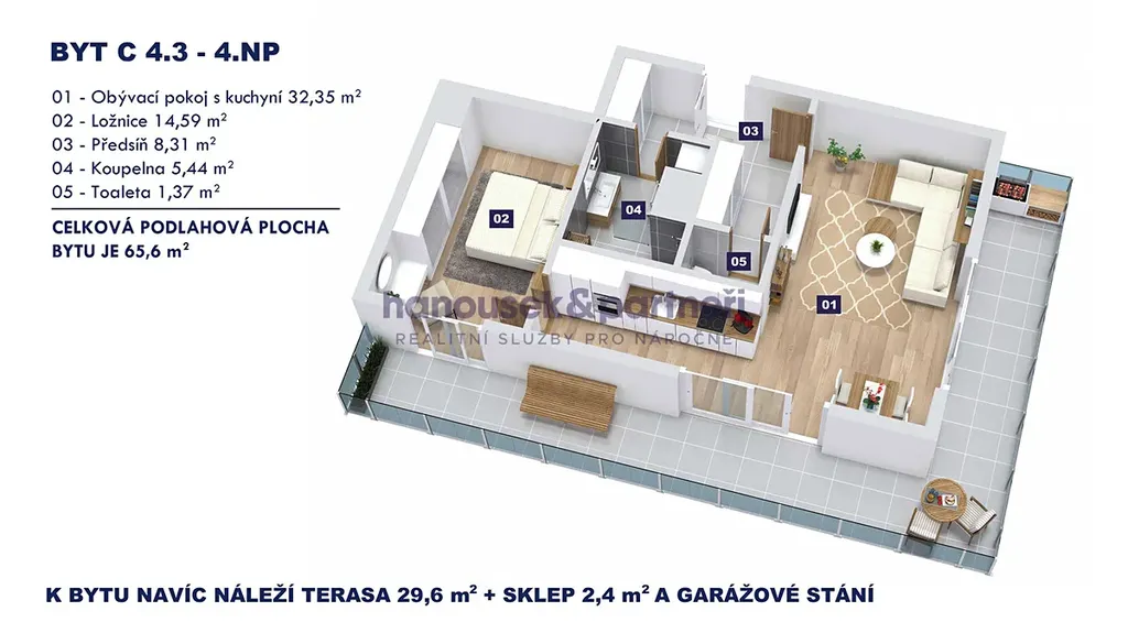 Nabízím vám byt s dispozicí 2+kk o velikosti 65,6 m2. V bytě je obývací pokoj s kuchyní, ložnice, předsíň, koupelna se sprchovým koutem a samostatné WC. Nachází se ve 4. patře domu C a navíc k němu patří terasa s výměrou 29,6 m2, sklep a garážové stání.