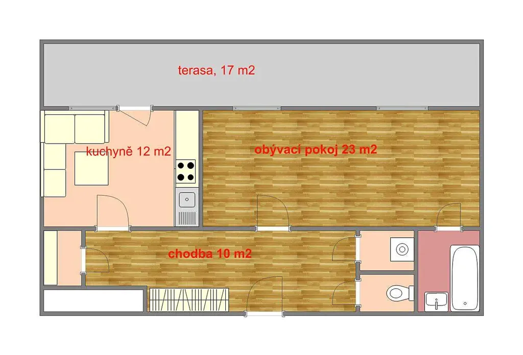 Dispozici tvoří prostorný obývací pokoj, samostatná kuchyně se vstupem na terasu, ložnice, koupelna, samostatné WC a dvě praktické komory přímo v bytě.