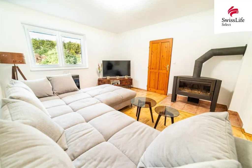 Samostatný domek (1+1): Vedlejší stavba (55 m), vlastní kuchyně, koupelna, sporáková kamna a krbová vložka. Ideální pro hosty, home-office nebo jako relaxační zóna s vlastní pergolou.