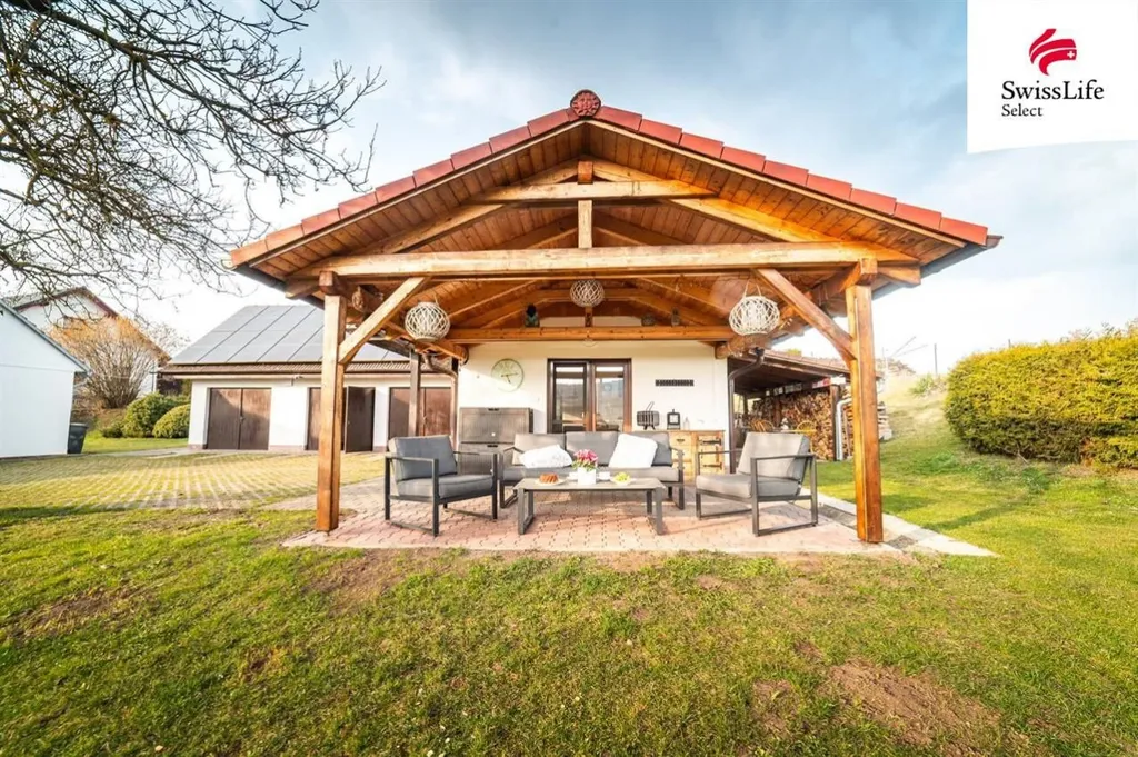 Venkovní zázemí: Druhá, prostorná pergola s letní kuchyní z masivu, ideální pro společenská setkání.