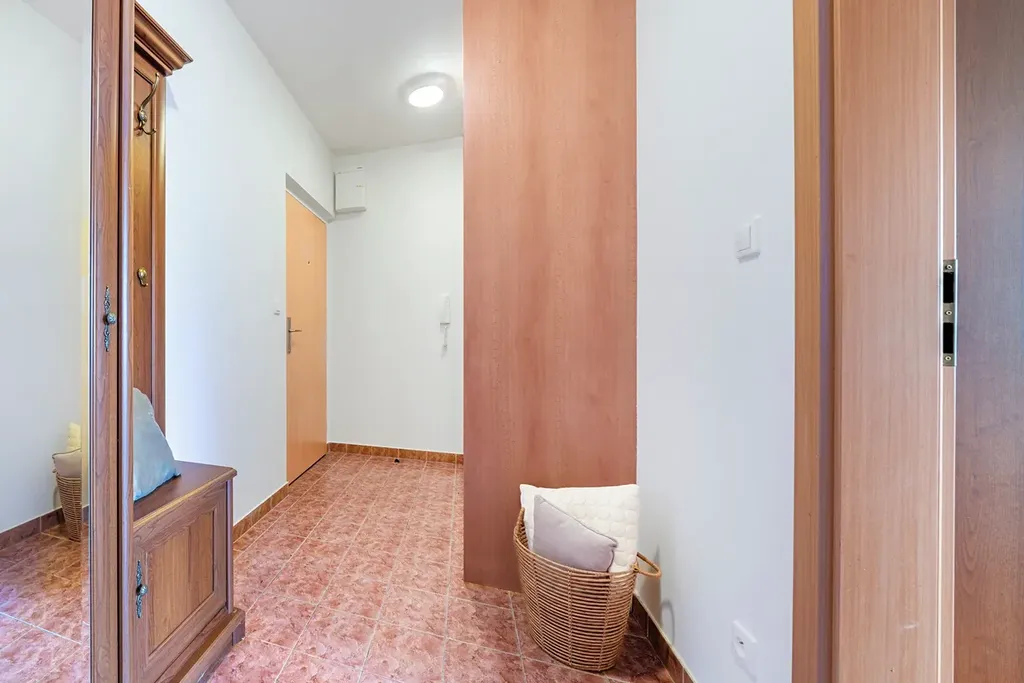Dispozice: Prostorná předsíň s vestavěnou skříní, hlavní obytná část s kuchyňskou linkou a barovým pultem se vstupem na balkon orientovaným do vzrostlé zeleně. Koupelna je vybavena vanou. Byt je ve výborném stavu a připraven k okamžitému užívání. U domu je parkoviště.