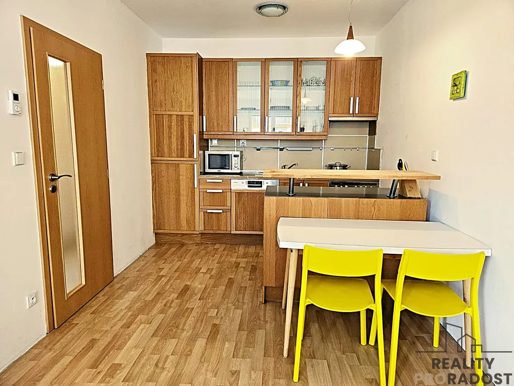 Byt se pronajímá zařízený. V obývacím pokoji s kuchyňským koutem o výměře 22m2 je kuchyňská linka vč. vestavěné ledničky, myčky nádobí, varné desky, trouby a digestoře, jídelní stůl a 2 židle, sedačka, pracovní kout a komoda. V ložnici o výměře 13 m2 se nachází dvoulůžková postel, dvě komody a pracovní stůl. Prostorné šatní skříně jsou umístěny v komoře.