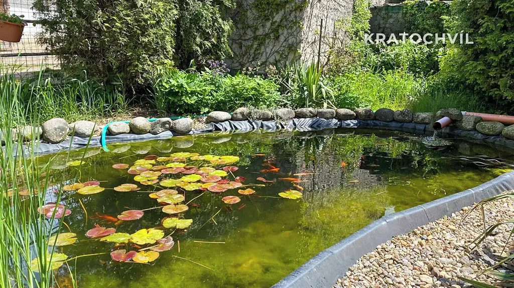 V přední části pozemku se nachází upravená zahrada se vzrostlými stromy, okrasnými keři a jezírkem, která vytváří příjemné soukromí a klidné prostředí pro bydlení.