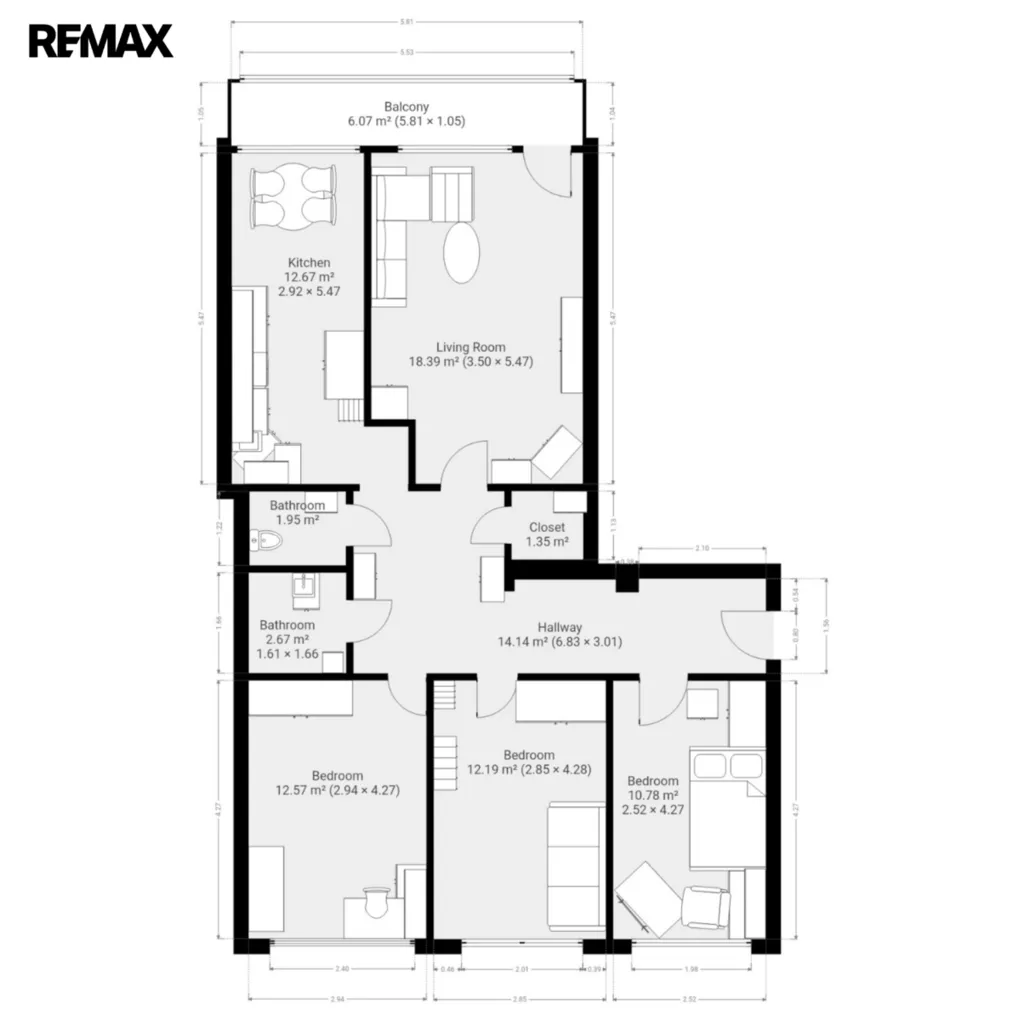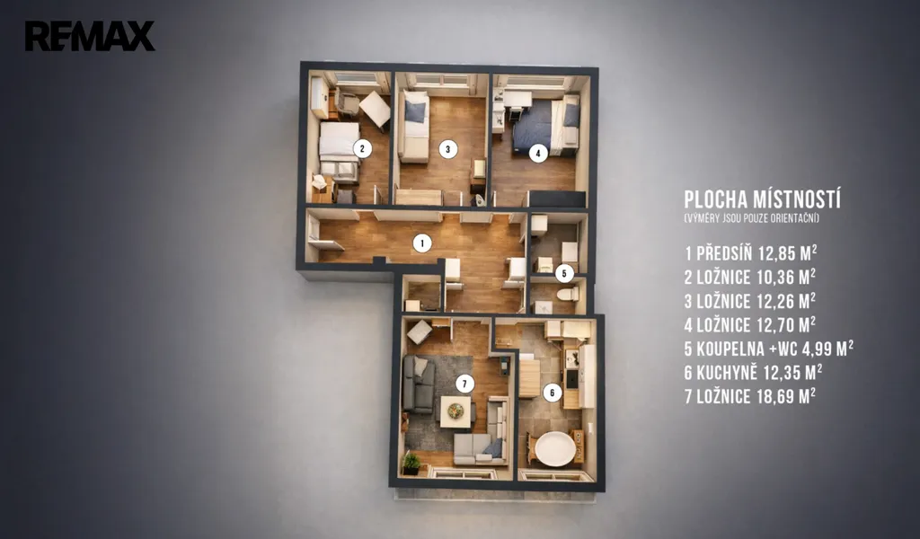 Dispozice bytu je prakticky řešena a nabízí dostatek prostoru pro rodinné bydlení. Byt tvoří tři samostatné ložnice, prostorný obývací pokoj s přímým vstupem na zasklenou lodžii se žaluziemi, kuchyně s jídelnou, dále komora, samostatná toaleta a koupelna s vanou. K bytu náleží také sklepní kóje. V domě je navíc k dispozici společná kolárna a kočárkárna, což ocení zejména rodiny s dětmi nebo aktivně založení majitelé.