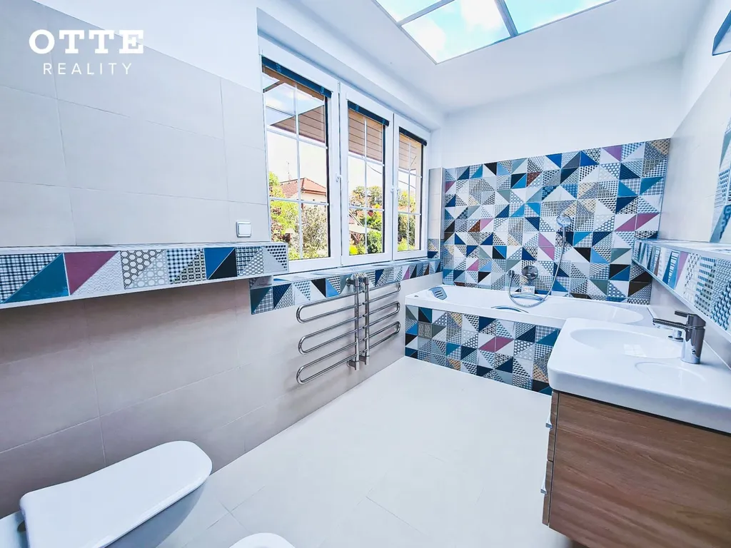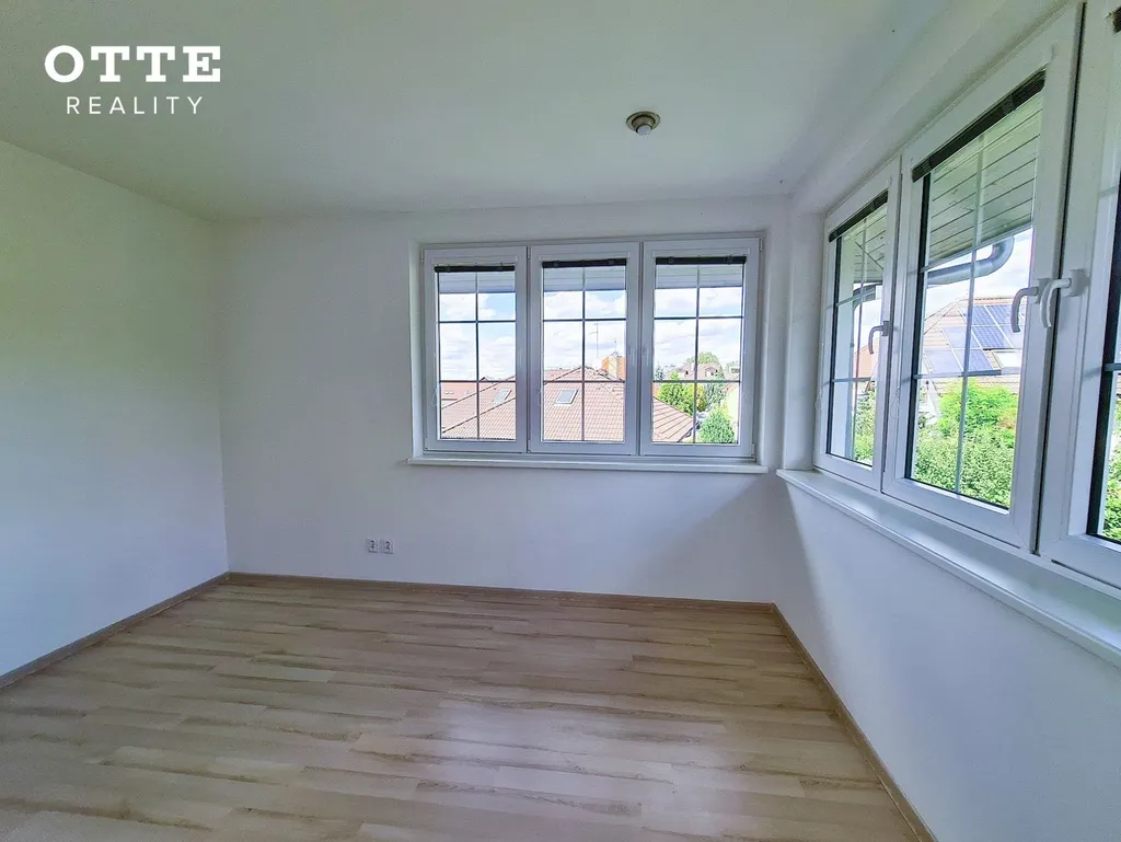 V prvním patře domu, kam vystoupáme dřevěným schodištěm je středová chodba se samostatnými vstupy do tří pokojů a prostorné koupelny s vanou, umyvadlem, WC a bidetem. Podlahy v prvním patře jsou osazeny laminátovou plovoucí podlahou i dlažbou. Ve všech oknech v prvním patře jsou umístěné vnitřní žaluzie. Okna jsou plastová, v přízemí osazená venkovními elektrickými žaluziemi.
