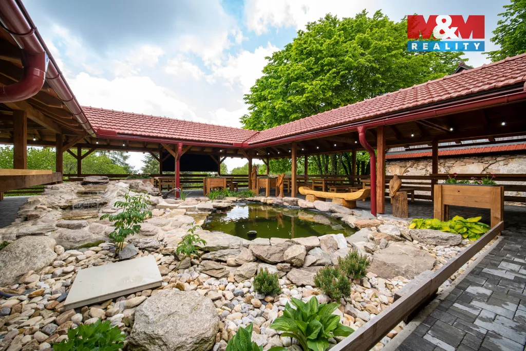 Gastronomie: Vyhlášená restaurace s kapacitou 200 míst (vnitřní sál, salonek, venkovní bar s grilem u jezírka) , s dvěma vybavenými kuchyněmi.