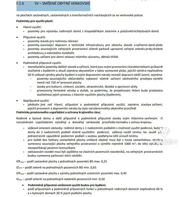 Na pozemku bude možné realizovat výstavbu rodinného domu, přičemž koeficient zastavěnosti činí 25 %, což odpovídá maximální zastavěné ploše 247 m². Regulativy dále umožňují výstavbu rodinných domů s jedním nadzemním podlažím s možností využití podkroví, případně bytových domů o maximálně dvou nadzemních podlažích včetně podkroví. Výškový rozdíl terénu lze využít pro jednostranně zapuštěné podzemní podlaží s návazností podlahy na nižší úroveň terénu.