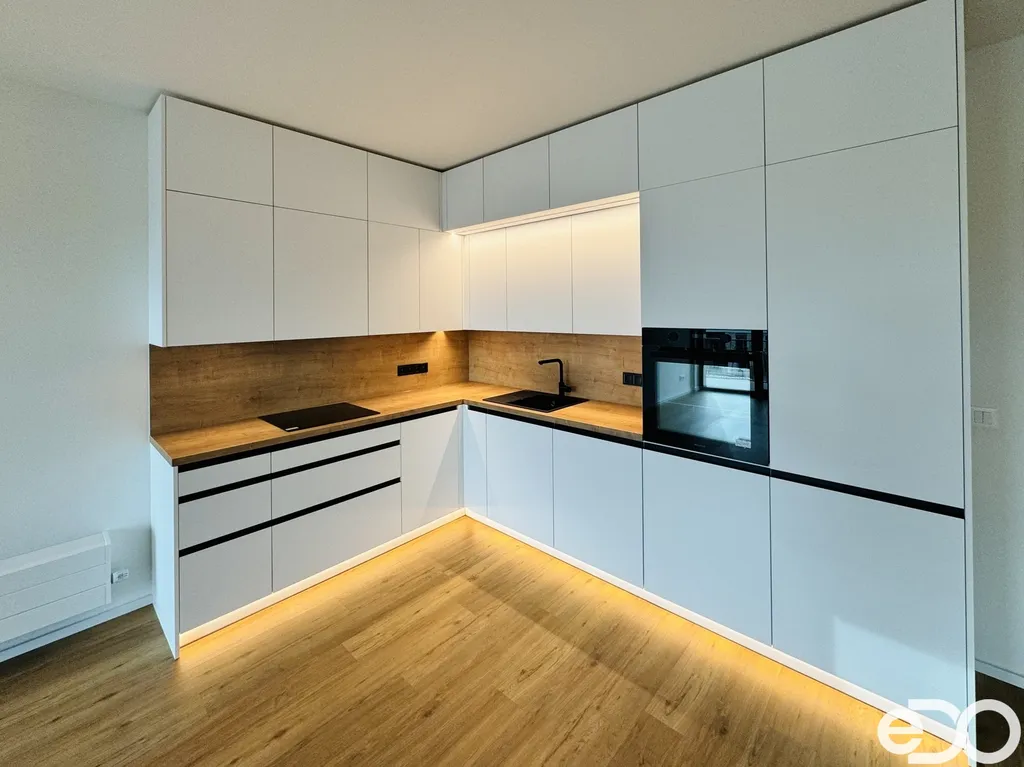 Součástí bytu je moderní kuchyňská linka včetně spotřebičů – myčky nádobí, indukční varné desky, lednice s mrazákem. V ložnici je vestavěná skříň, která nabízí komfortní úložný prostor. V rámci pronájmu jsou zde sklep a garážové parkovací místo.