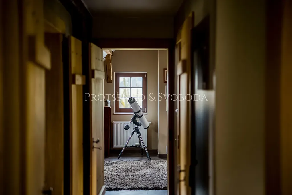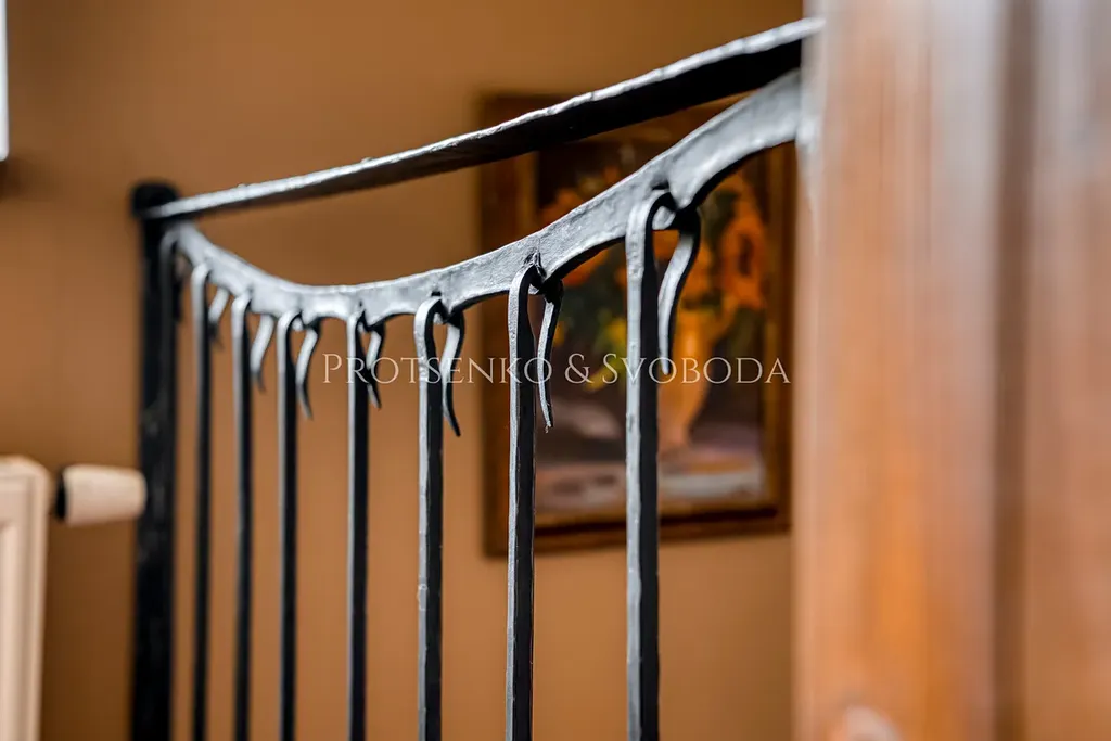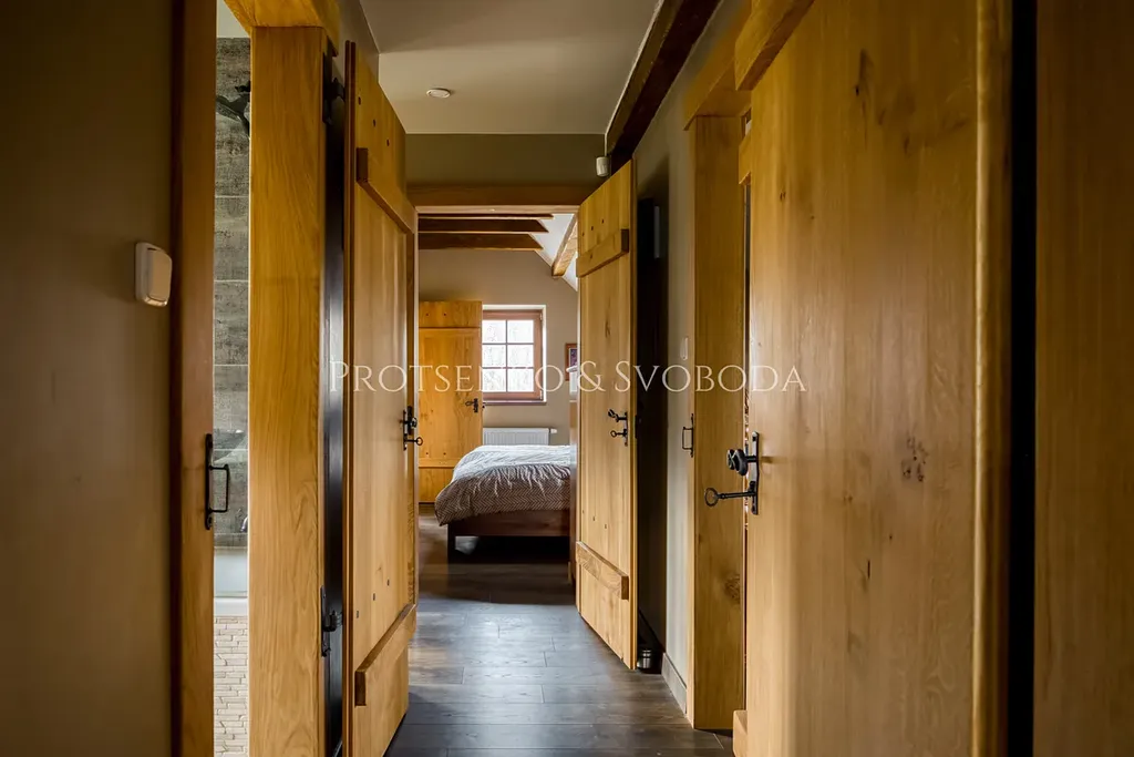 Nemovitost zaujme nejen svým vzhledem, ale i precizním řemeslným provedením. Interiér zdobí zakázkově vyráběné prvky z dubového dřeva, zejména schodiště a interiérové dveře. Výjimečný charakter domu podtrhují i ručně kované detaily — zábradlí, kliky, zavírací mechanismy dveří a další kovové prvky, které dodávají interiéru originalitu a noblesu.