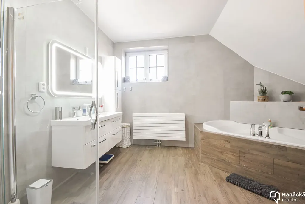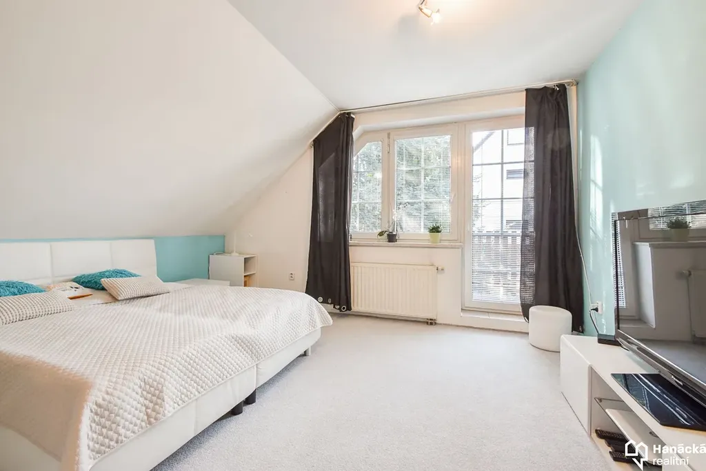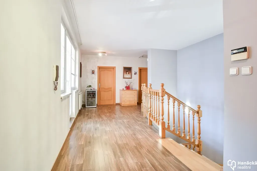 V patře se nachází tři ložnice, velká koupelna s vanou i sprchovým koutem, šatna a pracovna. Ze dvou ložnic je přístup na balkon a z haly na krytou lodžii.