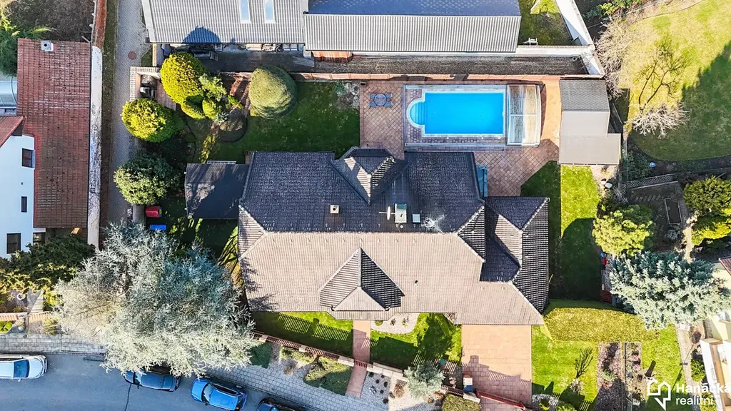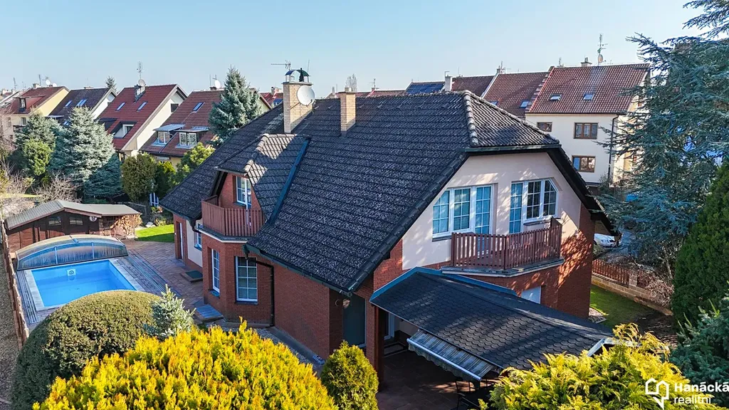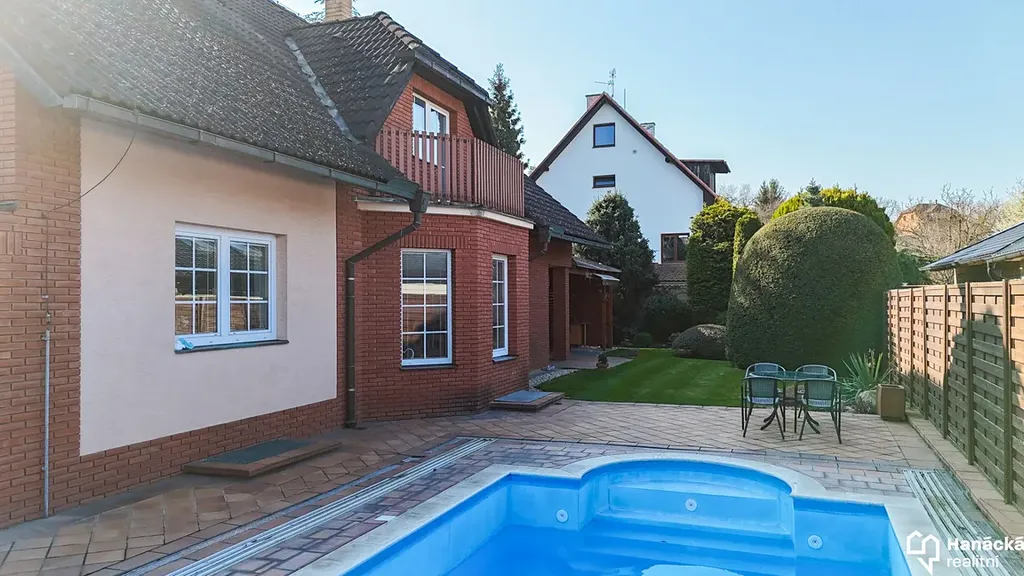 Dům stojí na pozemku o celkové výměře 939 m², přičemž zastavěná plocha činí 227 m². Součástí pozemku je také prostorný bazén, zahradní domek a pergola s posezením, přístupná přímo z obývacího pokoje.