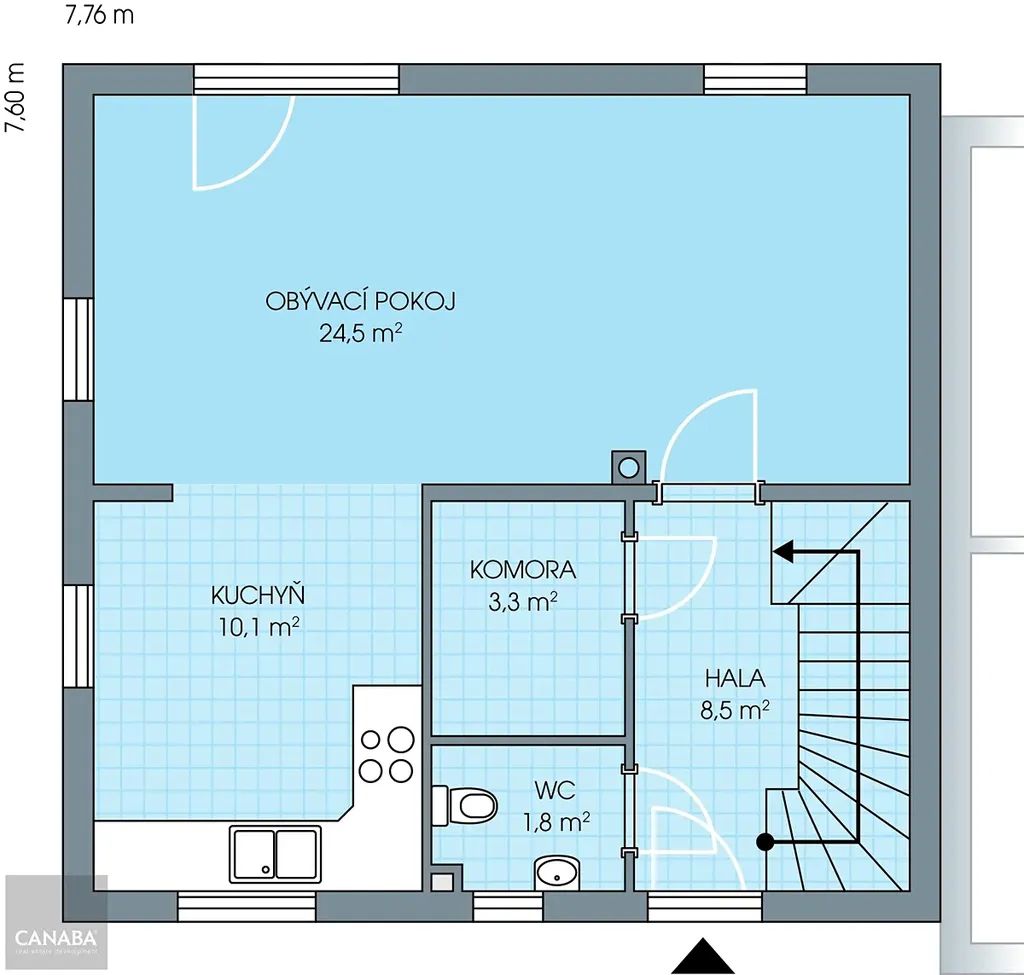 V přízemí se nachází vstupní hala, prostorný obývací pokoj s kuchyní a jídelnou (s výstupem na terasu), toaleta a praktická komora. V 1. patře vstupujete z galerie do ložnice a 2 pokojů a do koupelny s toaletou.