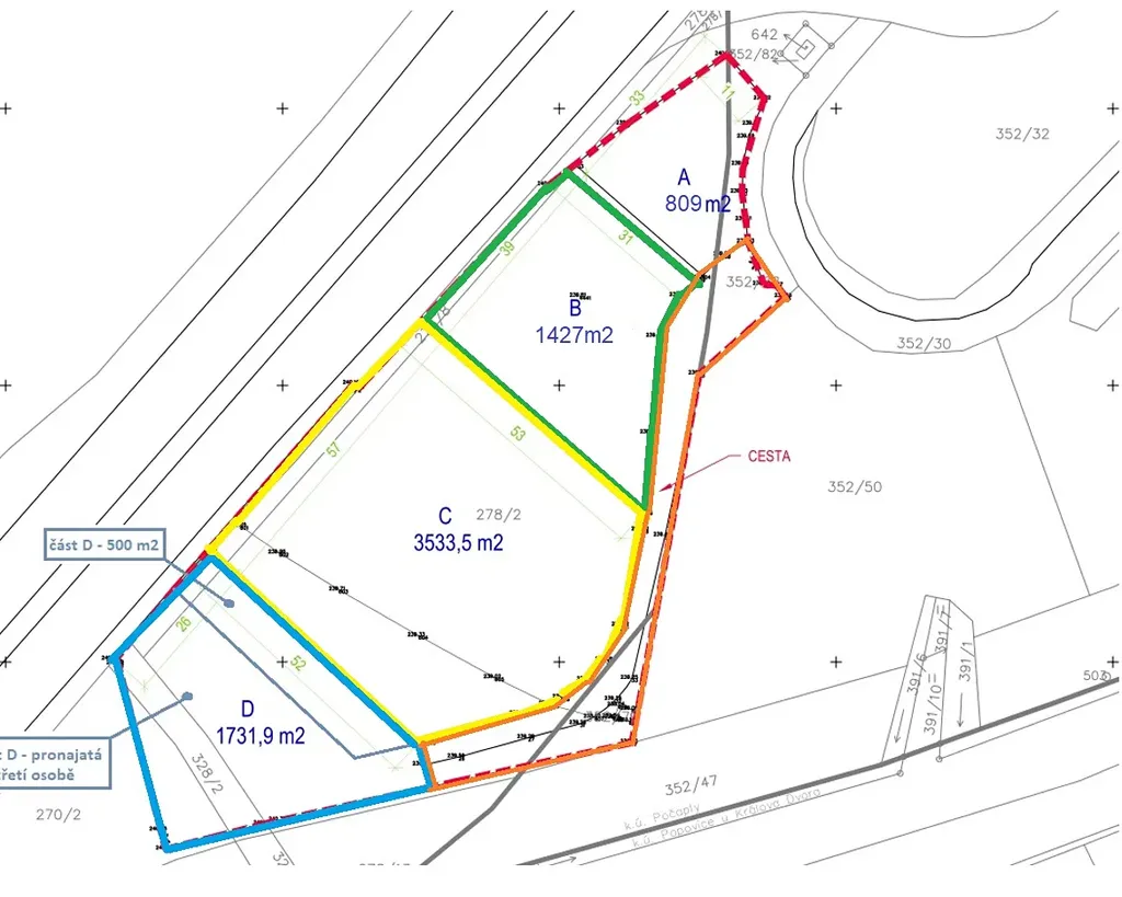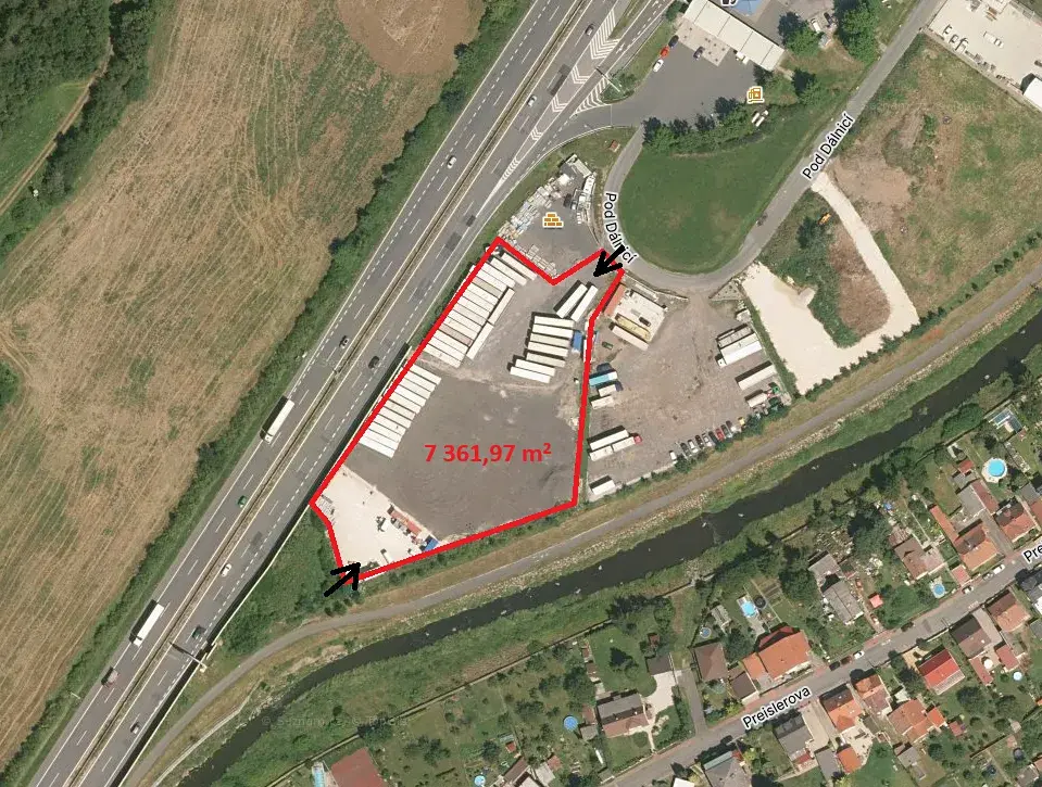 Pozemek tvoří části B, C a D (viz plánek), které nejsou vzájemně odděleny plotem, proto je plocha ideálně nabízena k pronájmu jako celek. Povrch pozemku je z asfaltového recyklátu, areál je oplocený, osvětlený a přístupný přes společnou příjezdovou komunikaci s dálkově ovládanou bránou. Z druhé strany je pozemek přístupný brankou pro chodce (z cyklostezky). K dispozici je elektřina a užitková voda ze dvou vrtů.