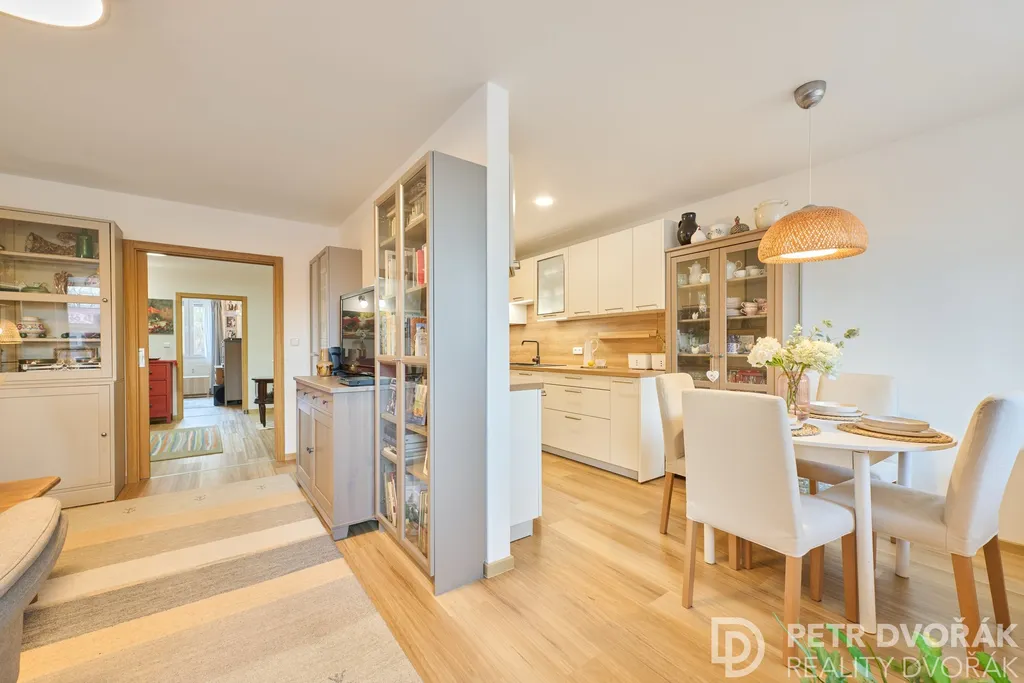 Aktuální dispozice bytu je řešena jako 4+1 / 4+kk, přičemž jeden z pokojů byl rozdělen akustickou stěnou na dvě samostatné místnosti. Díky tomu byt nabízí vysokou míru flexibility pro práci z domova, dětské pokoje nebo oddělené zázemí pro více členů domácnosti. Jednoduchým zásahem je možné dispozici vrátit zpět do původního řešení 5+1.