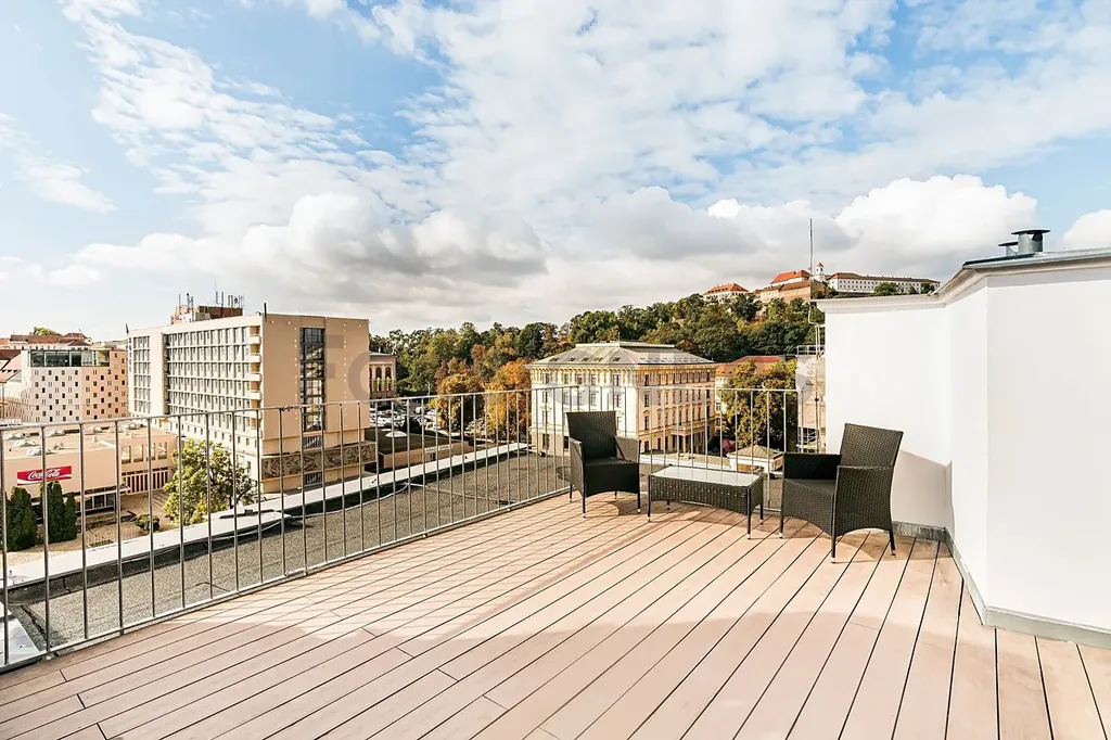 Velkým benefitem je velkorysá střešní terasa o velikosti 32 m², která nabízí krásný výhled na panorama města a hrad Špilberk.