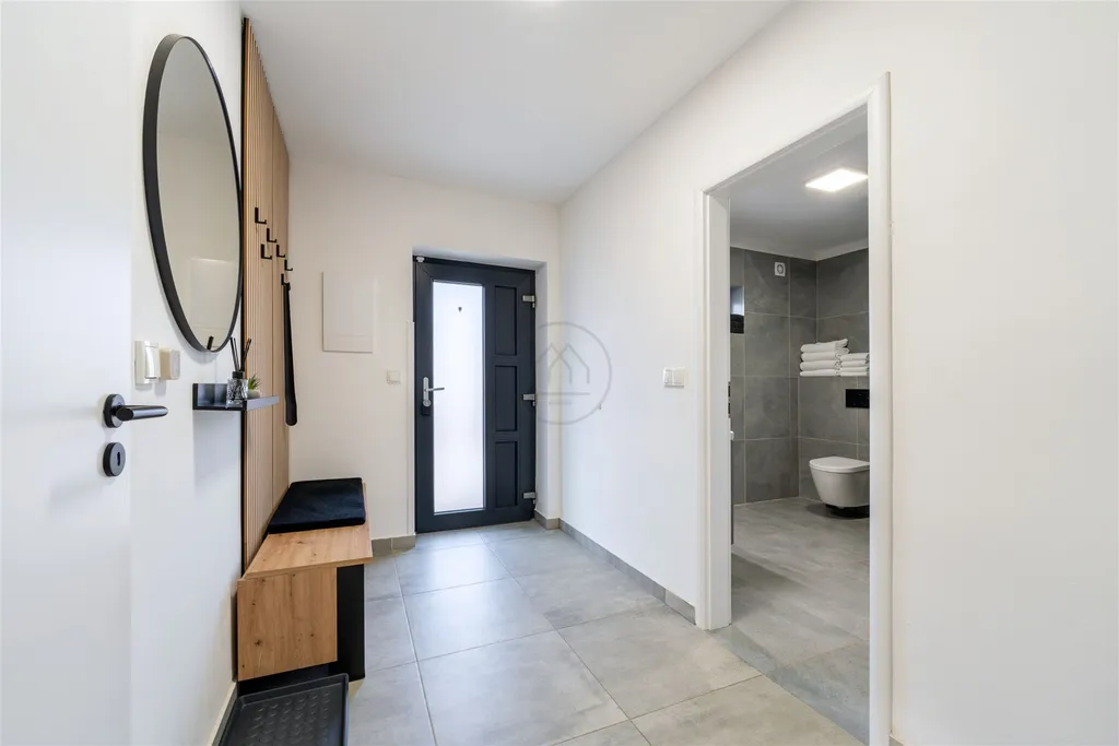 Z obou jednotek je zajištěn vstup na betonovou terasu a vlastní oplocenou zahradu se zahradním domkem, která nabízí ideální zázemí pro relaxaci. Jedná se o novostavbu z roku 2023 s energetickou náročností třídy B – velmi úsporná. Interiér i technologie odpovídají vysokému standardu: vytápění je napojeno na chytrou domácnost LOXONE pro efektivní správu na dálku a přístup do apartmánů zajišťují chytré zámky Nuki. Parkování se nachází přímo před domem.