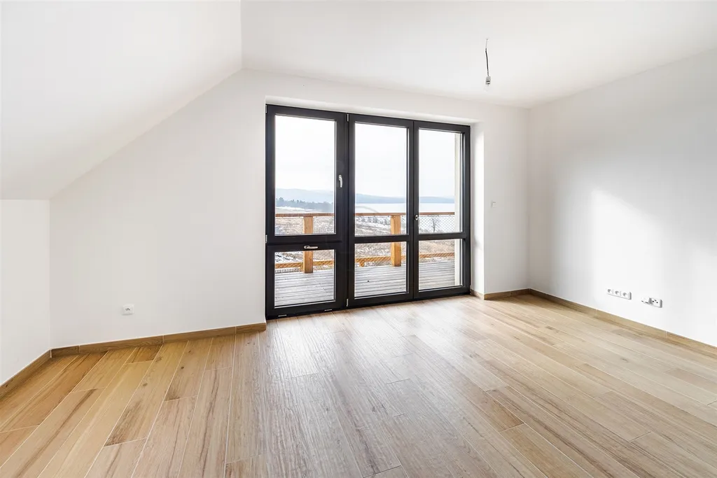 V ceně je zahrnuta kuchyňská linka, velkoformátové keramické obklady, dlažba a kompletní sanitární vybavení. K bytu lze dokoupit vlastní parkovací stání. Objekt je napojen na ČOV, vytápění a ohřev TUV zajišťuje úsporné tepelné čerpadlo. Okolí domu tvoří otevřená zahrada s přímým výhledem do zeleně a na vodu.