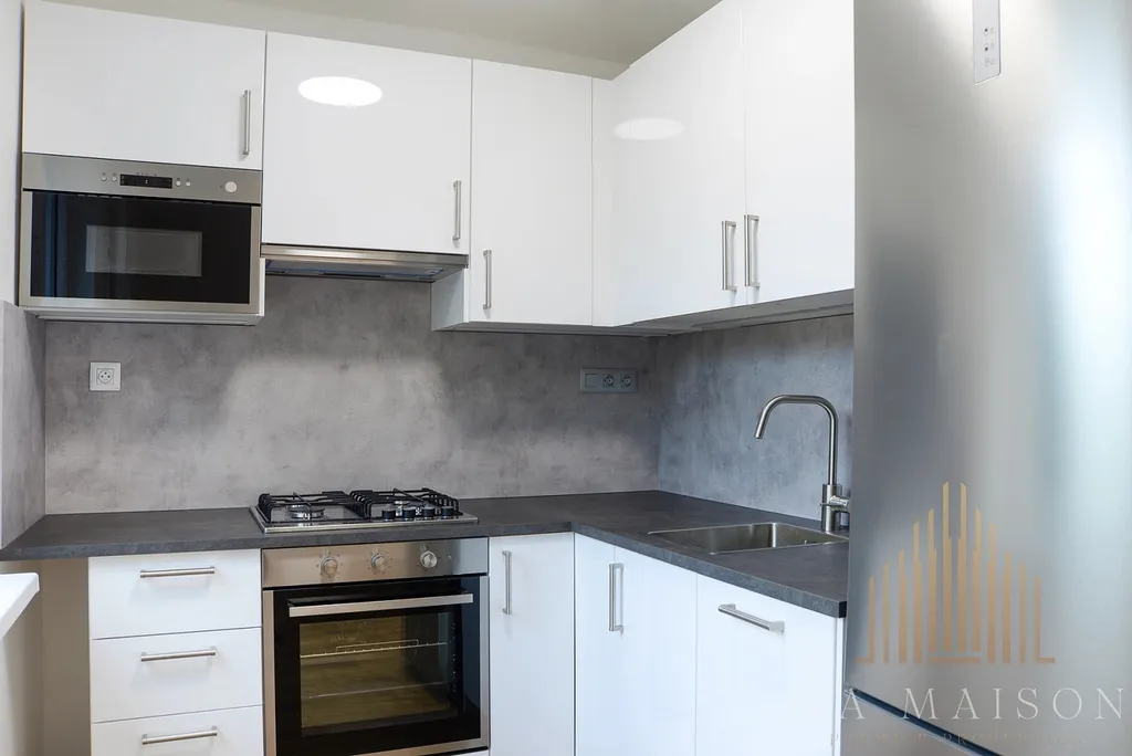 Přímo oproti vchodovým dveřím projdete do obývacího pokoje s kuchyňským koutem a úplně novou kuchyňskou linkou, vybavenou plynovým sporákem, elektrickou troubou, digestoří s odsáváním, mikrovlnkou, myčkou a lednicí s mrazákem. Z obývacího pokoje je přístup do prvního samostatného pokoje, který je největším z pokojů v bytě. Projdete-li chodbou od vchodových dveří vpravo, najdete dva samostatné pokoje, přičemž první z nich má i svůj balkon. Koupelna je vybavená vanou se zástěnou, galerií se zrcadlem a koupelovou skříňkou pod umyvadlem.
