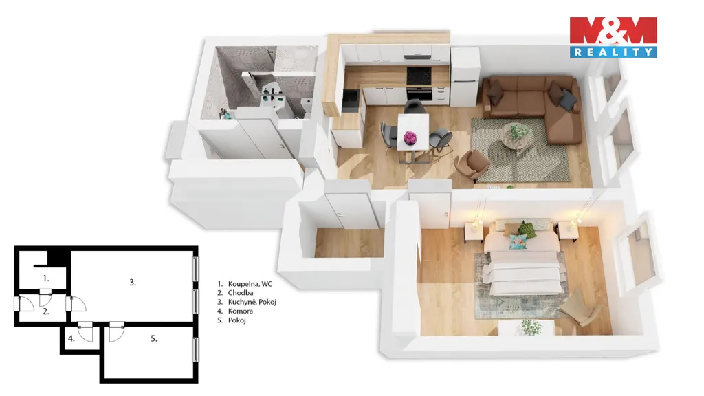 Dispozice bytu zahrnuje obývací pokoj s kuchyňským koutem, ložnici, předsíň s úložnými prostory a koupelnu se sprchovým koutem, toaletou a pračkou. V ložnici jsou k dispozici vestavěné skříně.