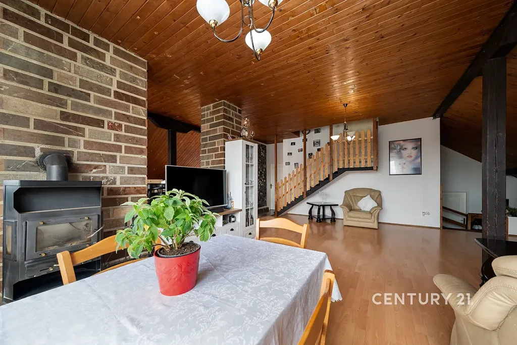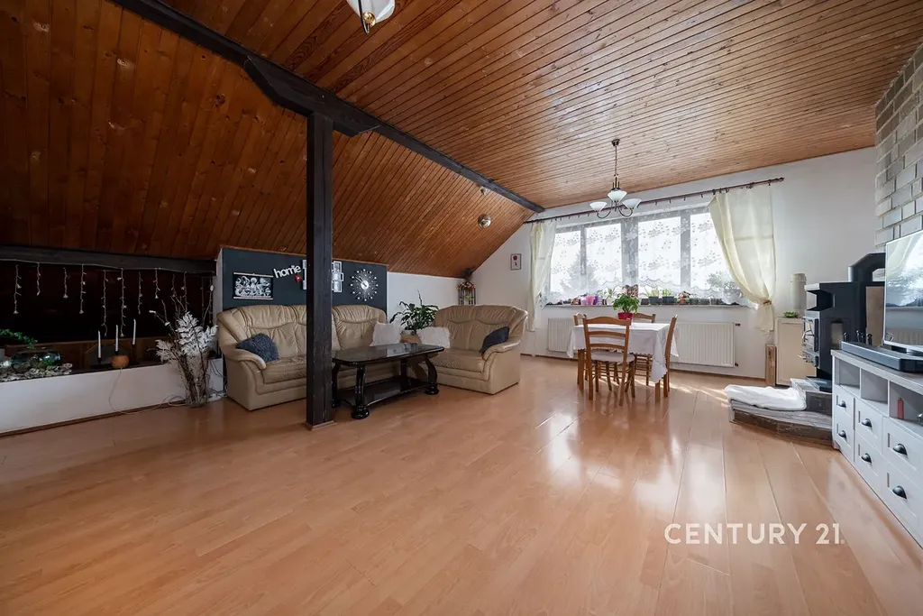 Interiér bytu působí velmi prostorně, čemuž dominuje nadstandardně velký obývací pokoj s krbem a kuchyňským koutem, který tvoří přirozené centrum domova. Dispozici dále doplňuje hlavní ložnice, dětský pokoj a další místnost, která v současnosti slouží jako praktická šatna. Byt je udržován ve velmi dobrém, byť původním stavu, což představuje ideální příležitost pro nového majitele, aby si prostor zrealizoval přesně podle svého vkusu a moderních standardů. Velkým bonusem je navíc 36 m² půdního prostoru náležícího k bytu, který lze stavebně propojit se stávající jednotkou a dále tak rozšířit obytnou plochu.
