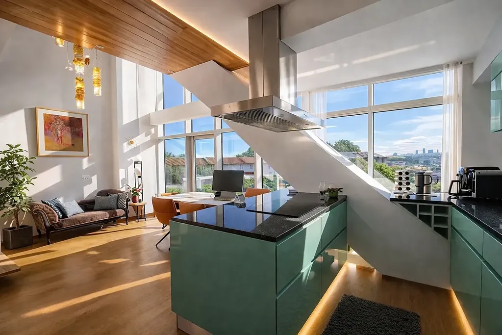 Dominantou spodního podlaží je velkorysý, světlý obývací prostor propojený s moderní kuchyní, s přímým vstupem na terasu. Ta představuje ideální místo pro relaxaci, soukromé posezení i společenská setkání s jedinečným výhledem na město.