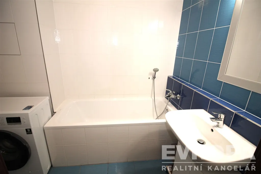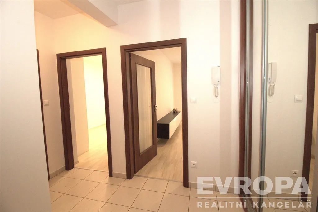 Byt je částečně vybavený, k dispozici Vám bude prostorná bílá kuchyňská linka s vestavěnými spotřebiči (lednice s mrazákem, trouba, varná deska, digestoř, mikrovlnná trouba a myčka) a jídelní stůl pro 2 osoby. V obýváku jsou zavěšené skříňky pod TV, gauč a taburet. Spoustu úložného prostoru poskytne vestavěná skříň na chodbě a šatní skříň v ložnici. Na podlaze v obýváku a ložnici je laminátová plovoucí podlaha, v ostatních místnostech je dlažba. Kvalitu bydlení zvyšují bezpečnostní skla a protihluková stěna v ložnici.