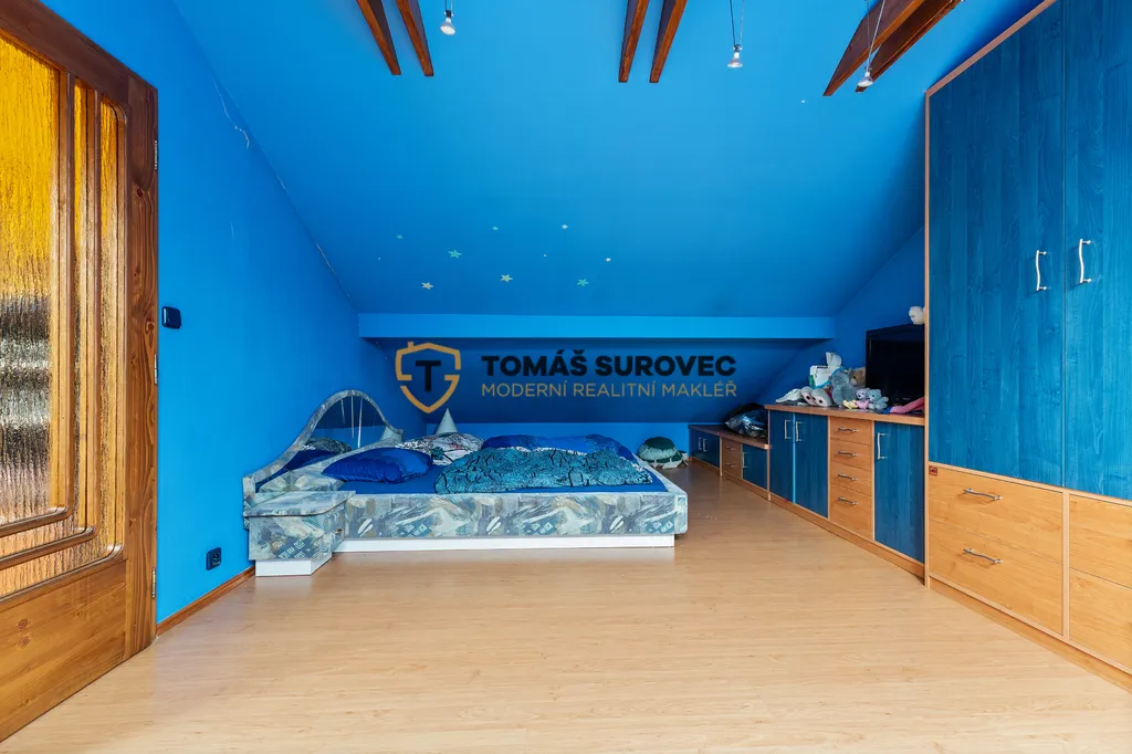 Horní patro nabízí soukromí a klid. Najdete zde ložnici, pracovnu ideální pro home office a koupelnu s toaletou. Podkroví pak přináší další variabilní prostor v podobě dvou průchozích pokojů, které mohou sloužit jako dětské pokoje, zázemí pro hosty nebo kreativní zóna podle vašich potřeb.