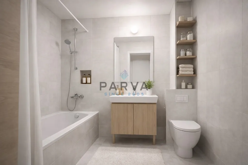 V bytě se nachází chodba s vestavěnými šatními skříněmi. Po pravé straně umakartové jádro , umyvadlo , menší vana a WC. Pokoj s kuchyňským koutem. Kuchyňská linka je z bílého lamina. Dominantou bytu je prostorná lodžie s výhledem do dalekého okolí.