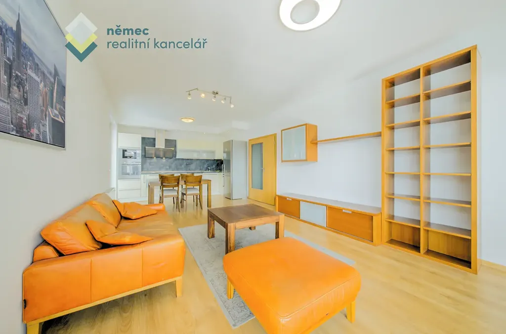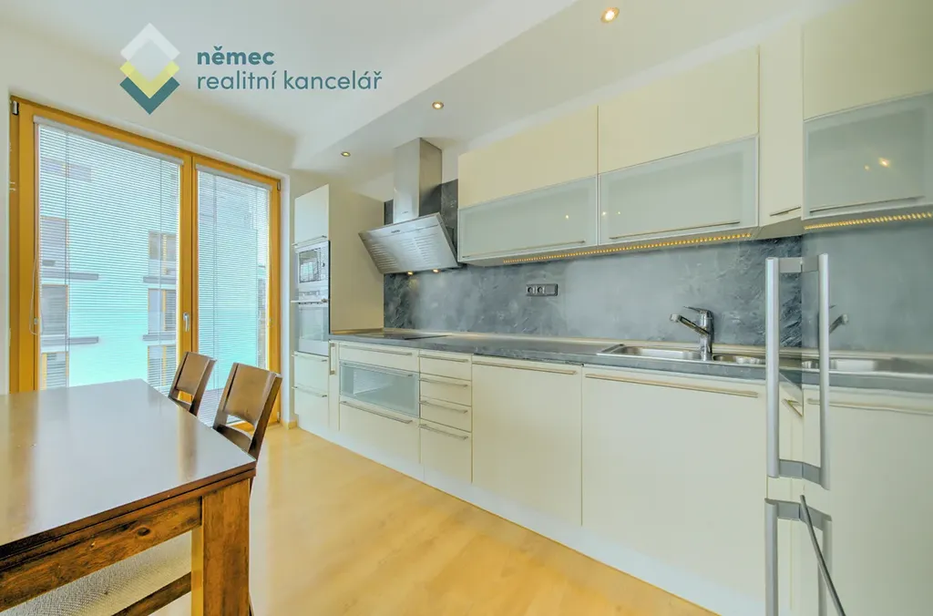 Toto 3+kk se nabízí včetně kompletního zařízení na fotografiích a je tedy možné sem přijet s kufrem a prakticky ihned bydlet. Za zmínku stojí hlavně celá řada vestavných prvků na míru, úložného prostoru je zde opravdu dostatek (2 obrovské vestavné skříně na míru v předsíni, jedna v každém z pokojů).