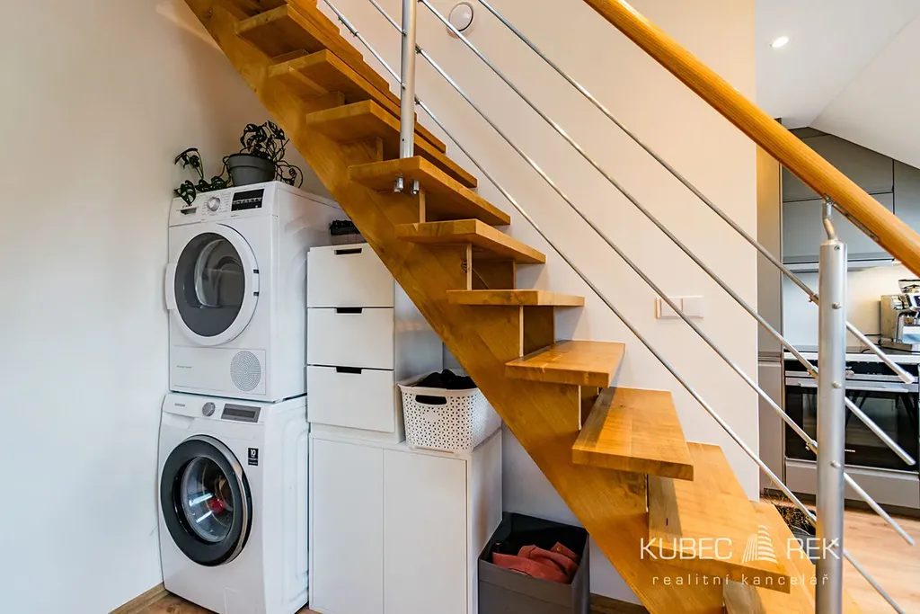 K dispozici je kuchyňská linka s elektrickou troubou, indukční varnou deskou, lednicí, myčkou nádobí a digestoří. Dále byt disponuje pračkou se sušičkou, jídelním stolem se židlemi, gaučem a matrací na spaní.