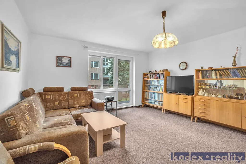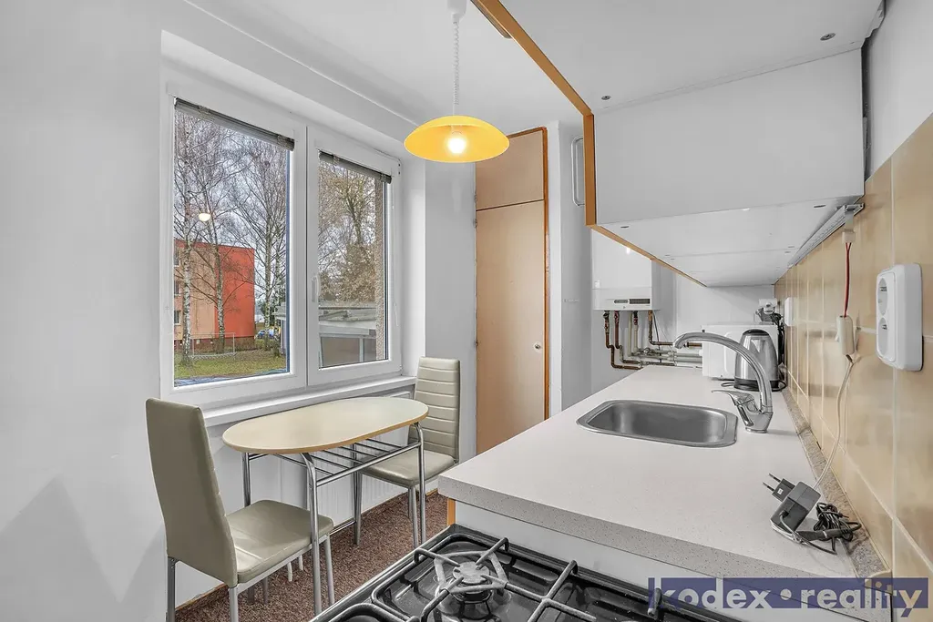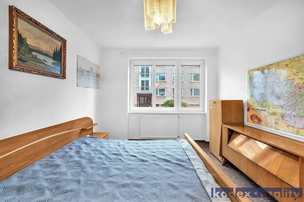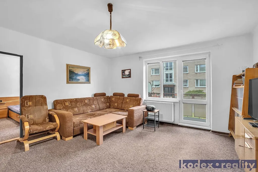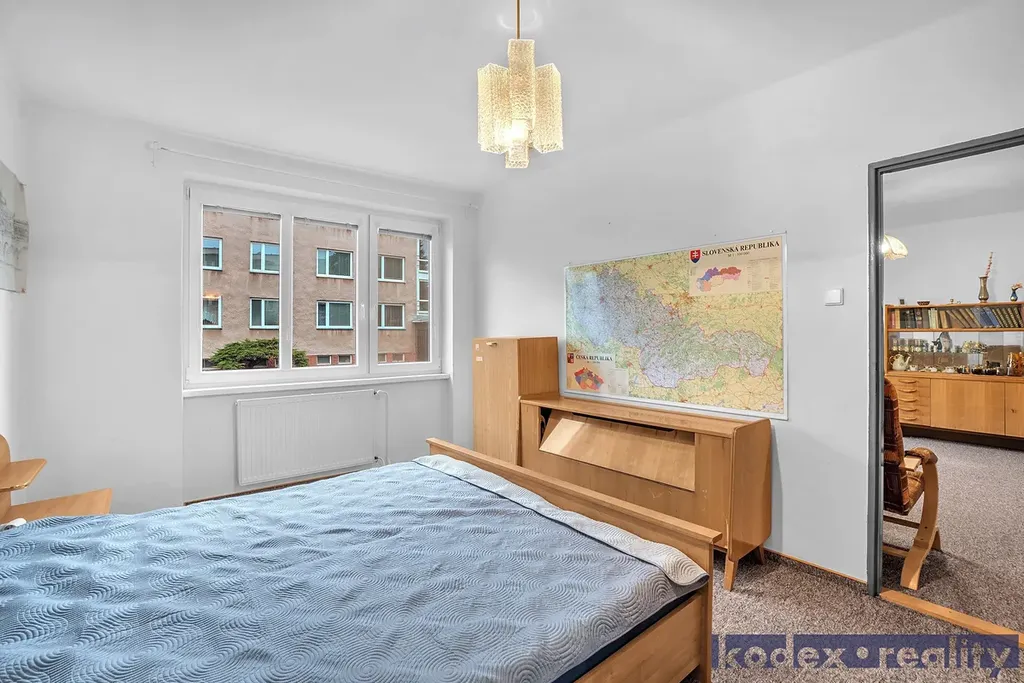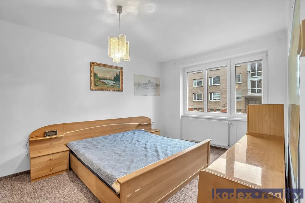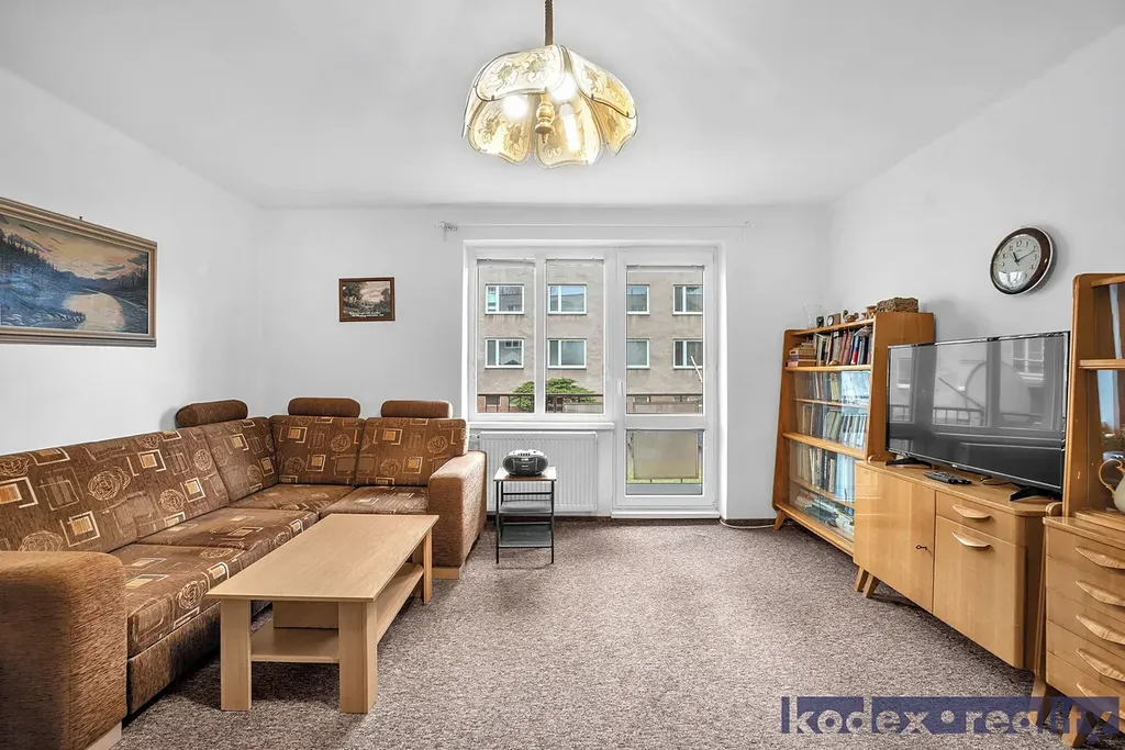Dispozice bytu: vstupní chodba s úložným prostorem, koupelna se sprchovým koutem a topným žebříkem, WC, kuchyň s místem na lokální plynový kotel, obývací pokoj se vstupem na balkon, dětský pokoj, ložnice, sklep v suterénu budovy.