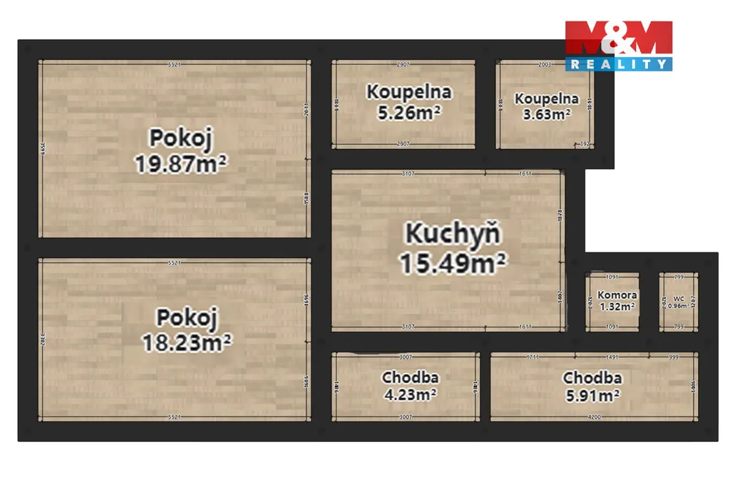 Byt se nachází v přízemí cihlového domu. V bytě dva pokoje, samostatná kuchyň, špajz, koupelna s vanou, druhá koupelna se sprchovým koutem, samostatné WC a předsíň.