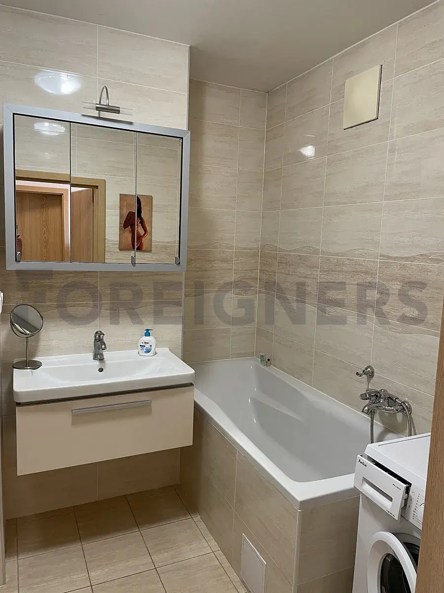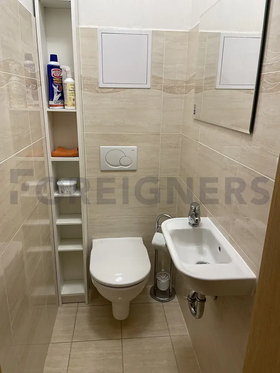 Po příchodu do hlavní chodby se po levé straně nachází koupelna s pračkou , vanou i sprchovým koutem a samostatná toaleta s umývadlem. Po pravé straně máme prostornou komoru s vestavěnými skříněmi. Z chodby vstupujeme do největší místnosti v apartmánu - obývacího pokoje spojeného s kuchyní. Na pravé straně se potom nachází samostatný pokoj, který je ideálně vybaven pro dítě nebo studenta, popřípadě může sloužit jako pracovna. Na levé straně máme umístěnou ložnici a šatnu.
