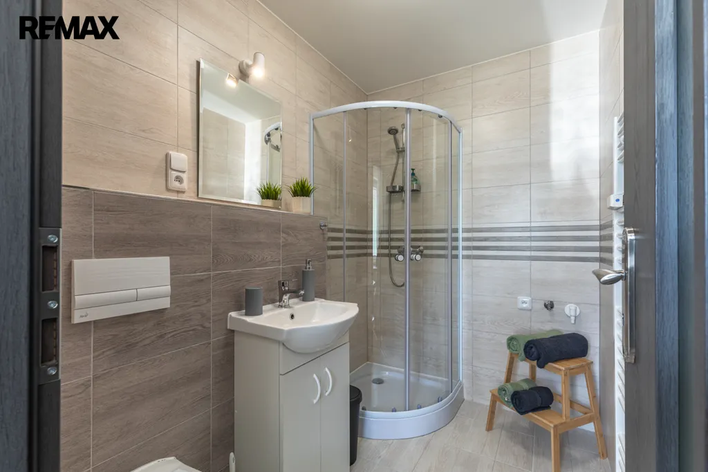 Byt zajišťuje nájemcům komfortní bydlení v příjemném novém interieru s novým vybavením: kuchyňská linka v praktickém rovném tvaru s volně stojíícm plynovým sporákem, digestoří, volně stojící MW troubou, v pokoji šatní skříň, pohodlné dvojlůžko, odkládací stolky, TV stolek s televizí, komoda, sedačka v šedé barvě, béžová koupelna se sprchovým koutem pro pohodlnou koupel, umývadlová skrříňka pro ukládání toaletních potřeb, na oknech žaluzie, podlahy - v pokoji plocoucí, v kuchyni a v předsíni dlažba. Vše zánovní, čisťoučké, voňavé, ihned k nastěhování. Součástí pronájmu je sklepní kóje hned za bytem.