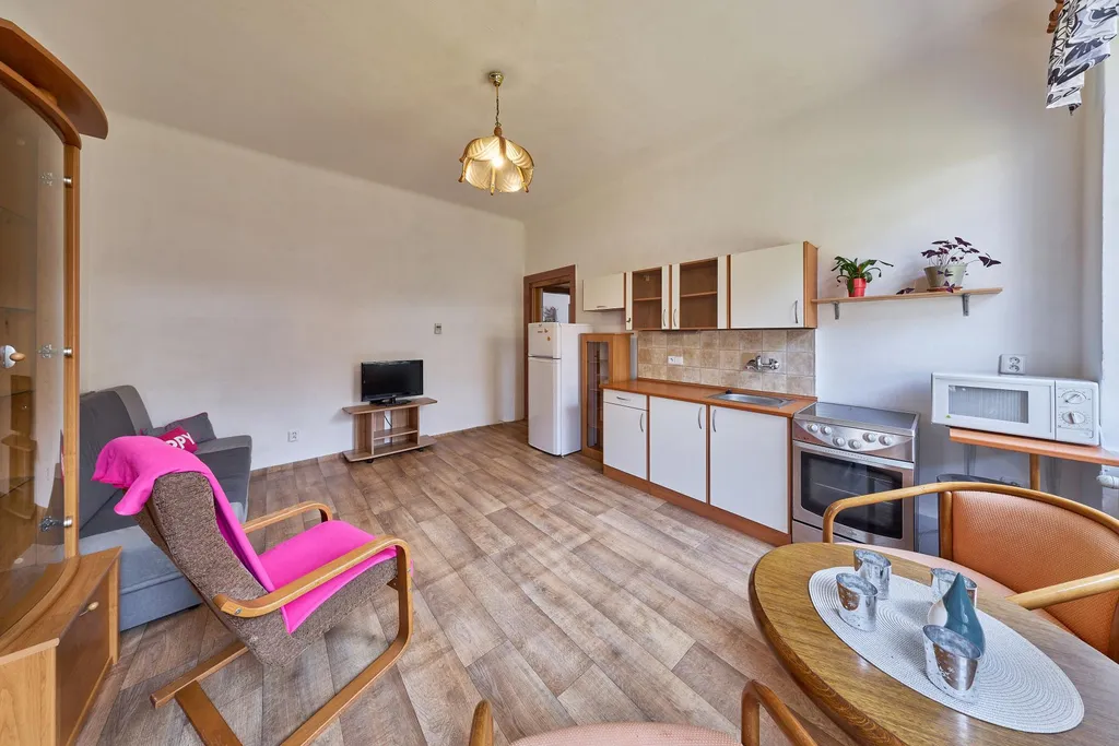 Vybavení a standard: Kuchyňská linka s dostatkem úložného prostoru, elektrický sporák s troubou, samostatně stojící lednice, mikrovlnná trouba.