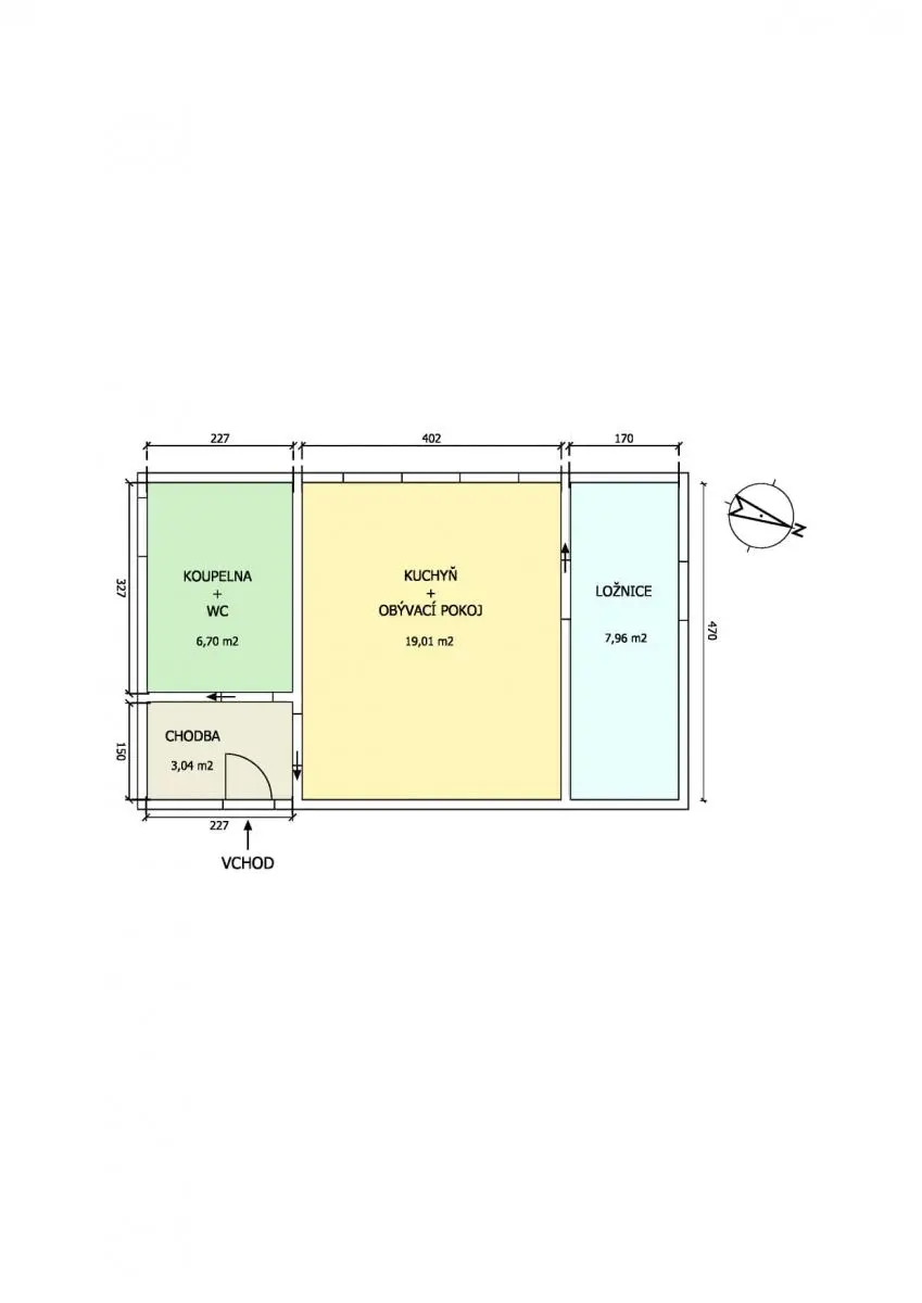 Dispozice bytu: Obývací pokoj s kuchyňským koutem 19,1 m2, pokoj 7,96 m2, koupelna s WC 6,70 m2, chodba 3,04 m2.
