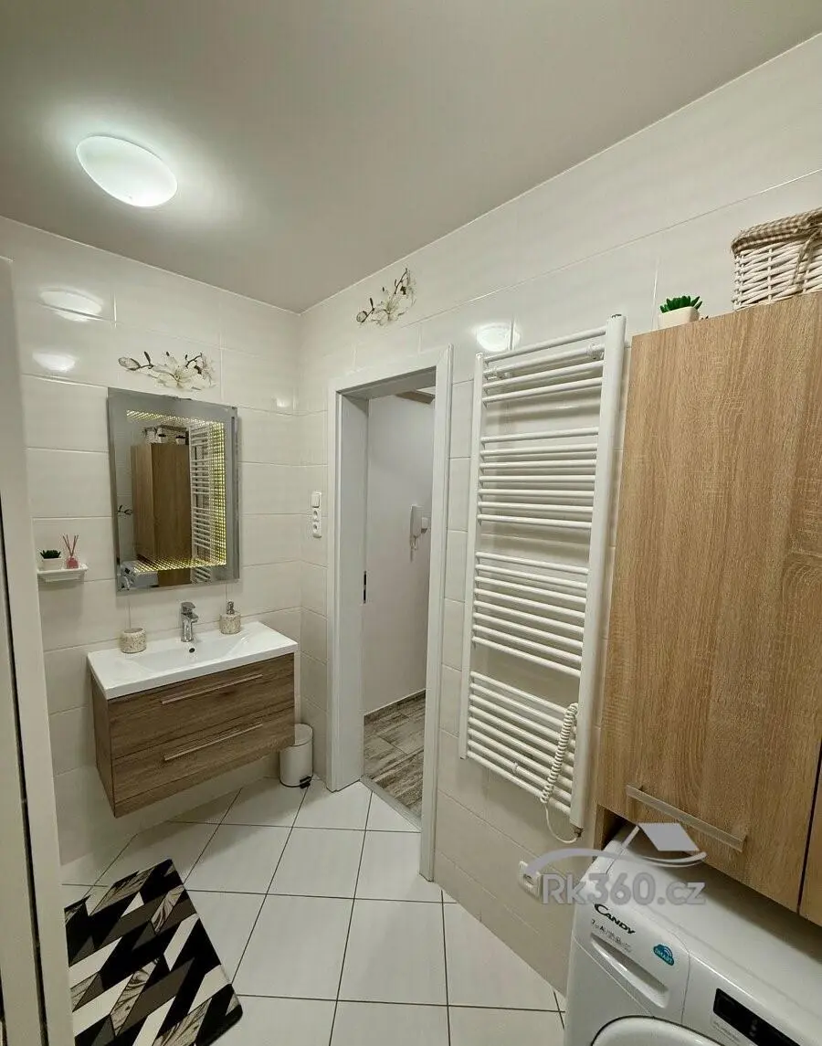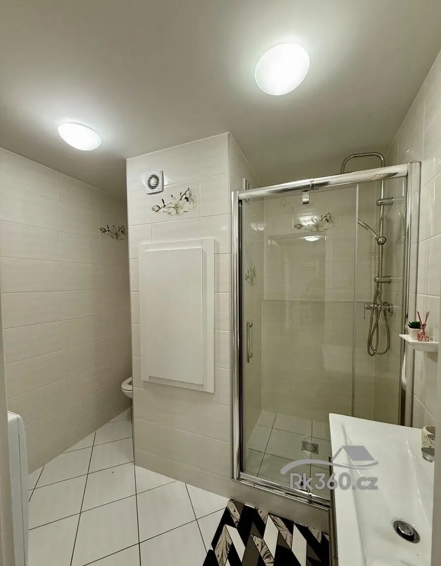 Koupelna: sprchový kout se skleněnou zástěnou, závěsná toaleta, umyvadlo, topný žebřík, odvětrávání a prostor pro pračku i sušičku.