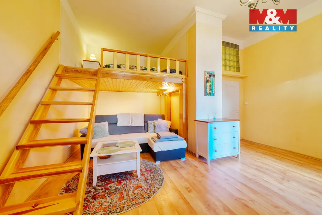 Nabízíme útulný byt 2+kk cca 60 m² v 1. podlaží ze 6-ti prvorepublikové vily v nejkrásnější ulici Karlových Varů – Krále Jiřího. Byt působí teple a klidně: předsíň, obývací pokoj s kuchyní, jídelním koutem a patrem na spaní, další pokoj s vlastním patrem a koupelna s vanou vytvářejí příjemné zázemí.