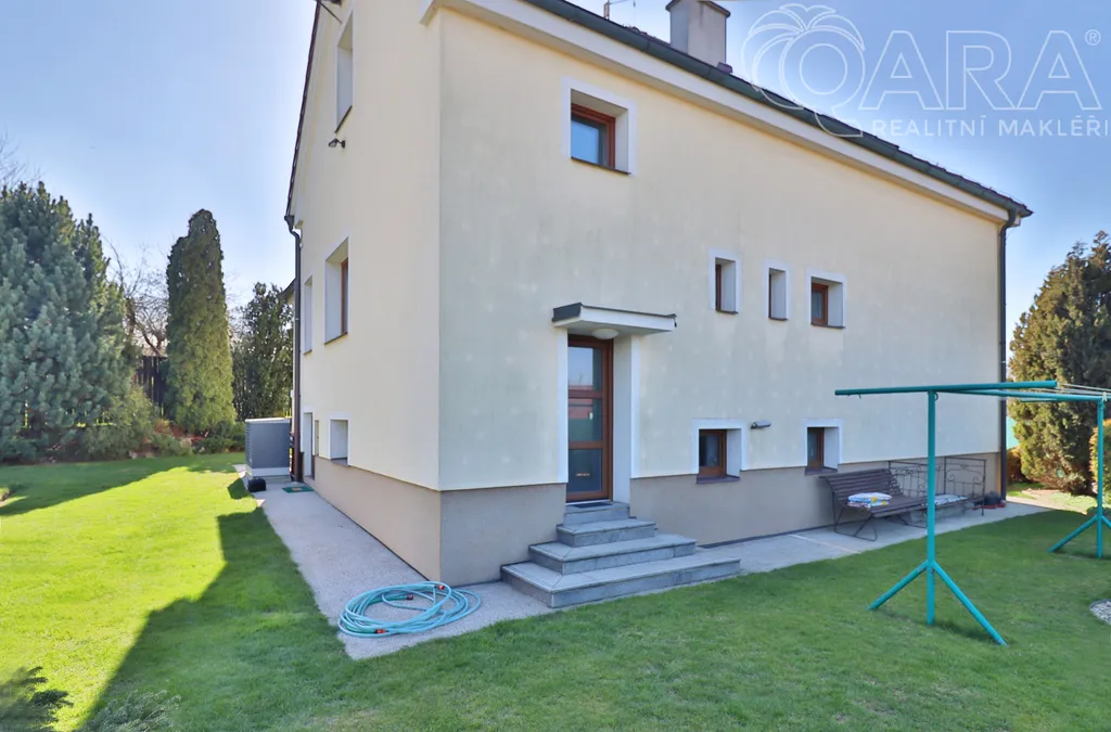 Exteriér domu je skutečnou předností – zahrada o rozloze cca 1 367 m² je vybavena okrasným jezírkem, skleníkem a krytým, vyhřívaným bazénem (6,4 × 4,2 m, hloubka 1,6 m), který lze využívat od jara do podzimu. Nechybí ani automatická závlaha napojená na retenční nádrže - 10 m3 a 13 m3, dvě studny (kopaná 29 m a vrtaná 42 m) a moderní čistička odpadních vod (Biova - 2024).