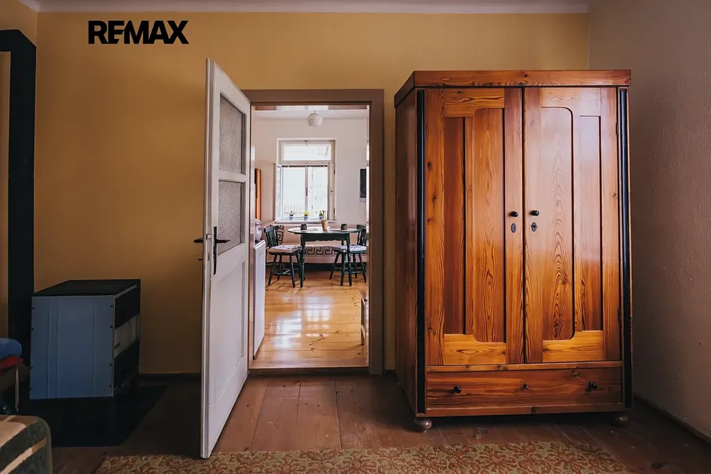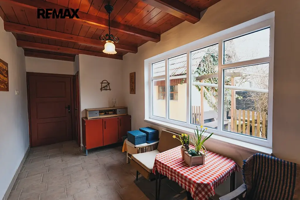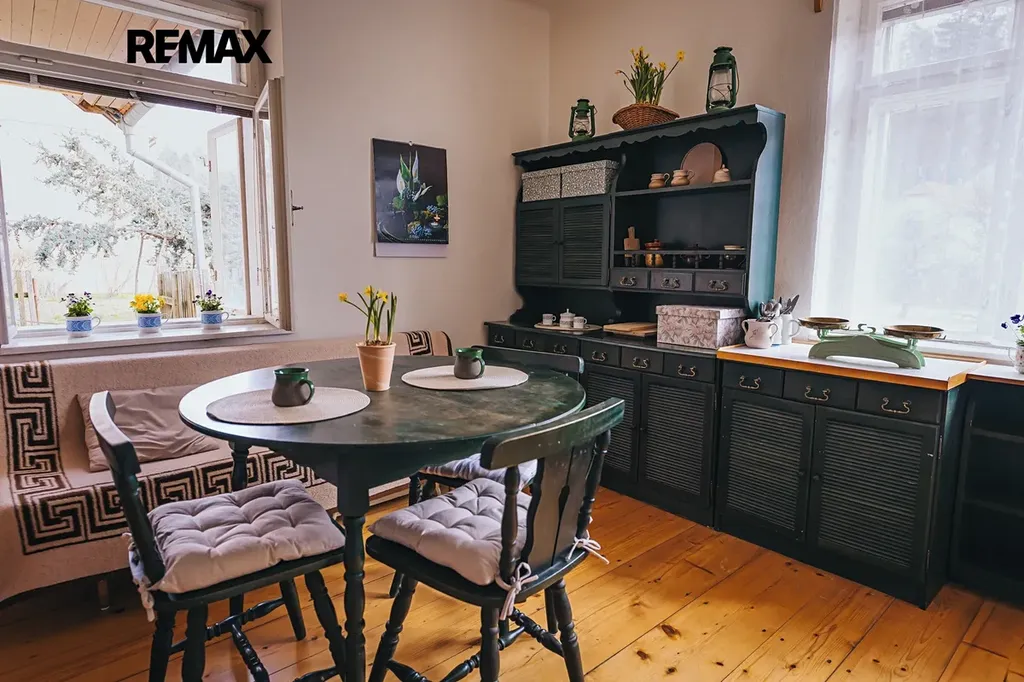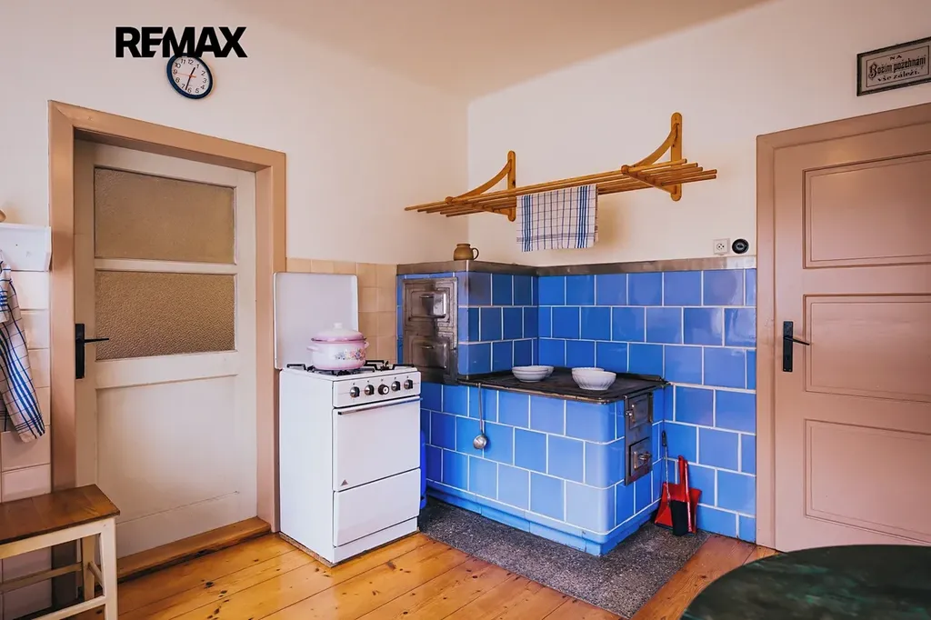 Dům z roku 1959 je pečlivě udržovaný a v roce 2006 byla provedena dostavba verandy. Má atmosféru, kterou novostavby umí málokdy vytvořit. Kuchyň s kachlovými kamny, původní kredencí a prkennou podlahou doplňuje obývák, kde dřevo v kamnech praská jako starý příběh. V každé obytné místnosti i v koupelně jsou kamna — teplo tu není funkce, ale rituál, který vás spojí s rytmem domova a přírody.