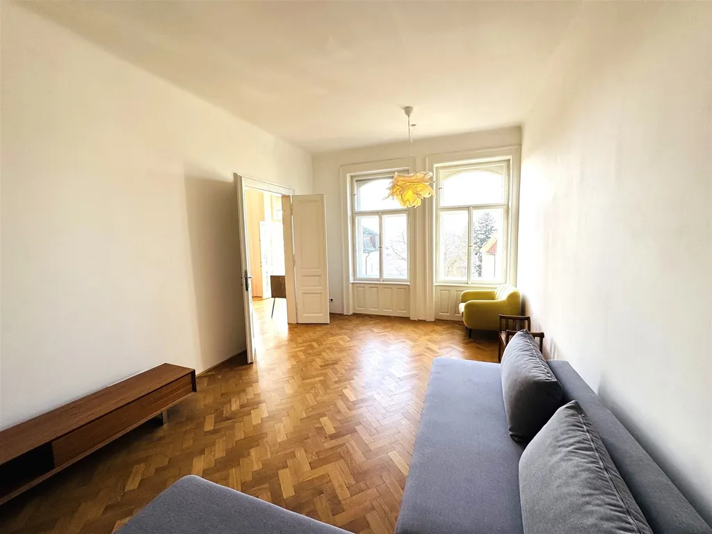 Nabízíme k pronájmu výjimečnou, nadstandardně zrekonstruovanou a částečně vybavenou bytovou jednotku, situovanou v jedné z nejprominentnějších a nejklidnějších ulic pražských Vinohrad – v ulici Dykova.