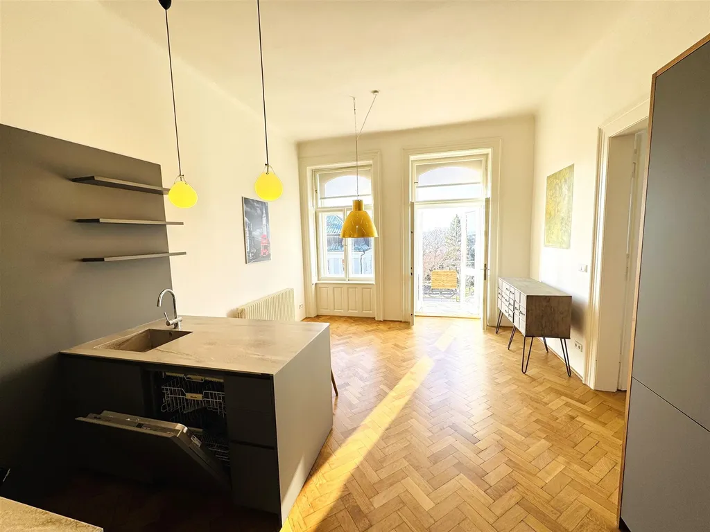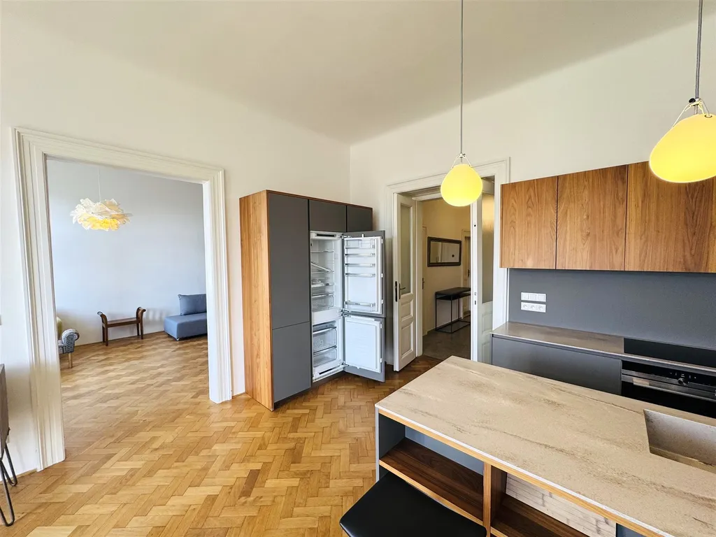 Tento reprezentativní byt o dispozici 2+1 s balkonem a celkovou podlahovou plochou 95 m² (včetně balkonu) se nachází ve 2. patře pečlivě udržovaného cihlového domu. Interiér je výsledkem kompletní a náročné rekonstrukce, která harmonicky skloubila historický šarm s moderním designem, nejkvalitnějšími materiály a současnými technologiemi.