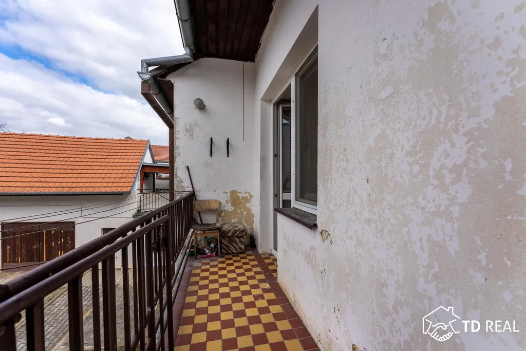 Dispozice: vstupní chodba, samostatná toaleta, koupelna, technická místnost, kuchyně, která je průchozí do obývacího pokoje 21,4 m². Z chodby je vstup na balkon, ze kterého je po schodech přístup do dvorní části a také zahrady.