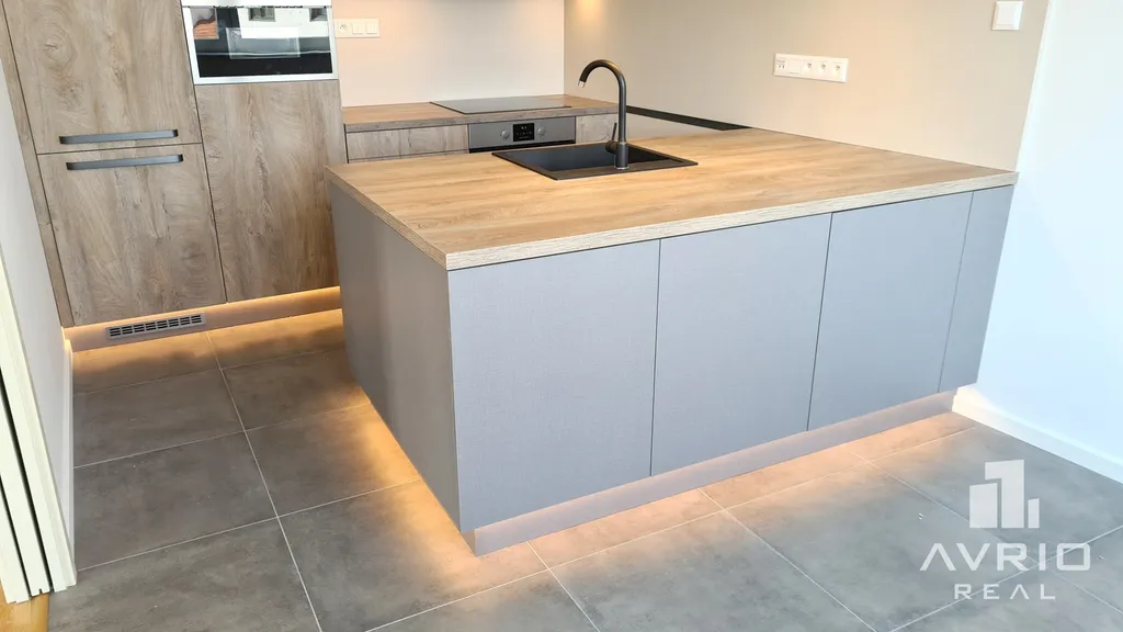 Celková plocha bytu je 106,28 m2, k němu náleží dvě terasy 3,68 m2 a 6,8 m2. Dispozice bytu: kuchyně (oddělena posuvnými dveřmi) 14,42 m2, obývací prostor 39,22 m2, ložnice 12,22 m2, druhá ložnice 13,18 m2, hala 8,24 m2, předsíň 4,30 m2, šatna 2,40 m2, koupelna s WC 8,80 m2, druhé samostatné WC 3,50 m2. Byt se pronajímá jako částečně zařízený - tzn. kuchyňská linka včetně vestavěných spotřebičů tak, jak ji vidíte ve fotogalerii.