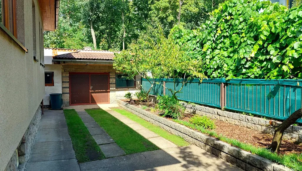 Zahradu s okrasnými a ovocnými dřevinami i dům od lesního pozemku odděluje vysoký zděný plot s brankou a přístupem na lesní pozemek.